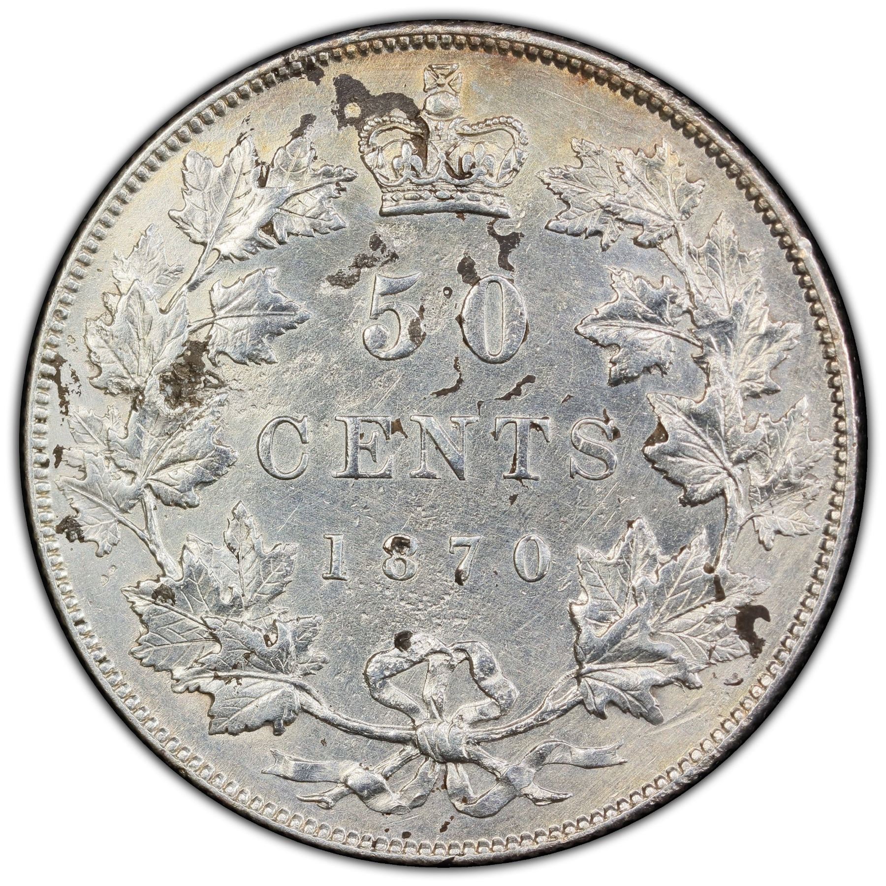 Canada Fifty Cents 1870 L.C.W., PCGS AU Detail, Harshly Cleaned. A sharp coin with nice obverse that would make for an excellent type-piece, with a hint of light golden toning
