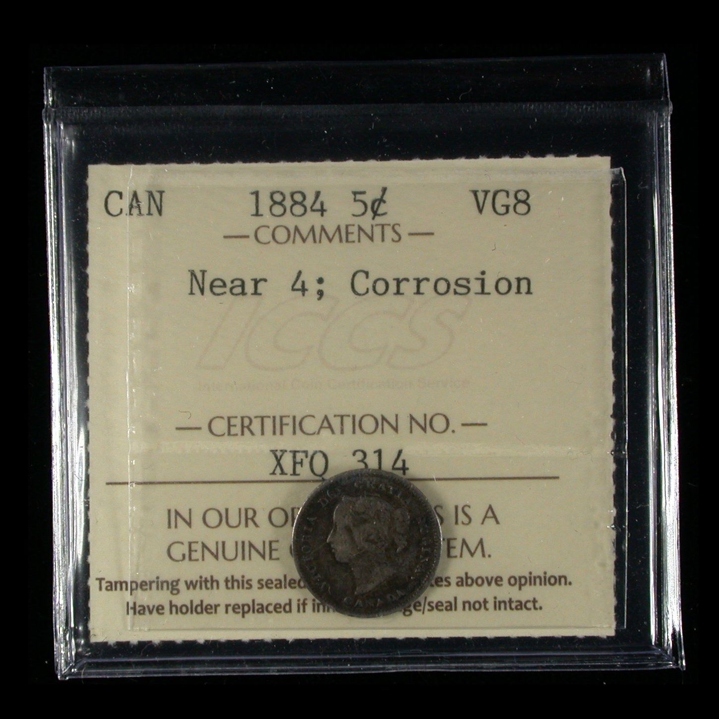 Five Cents 1884 Near 4, ICCS VG-8 with light corrosion mostly cloaked in the even medium toning; with nice bold date & legends