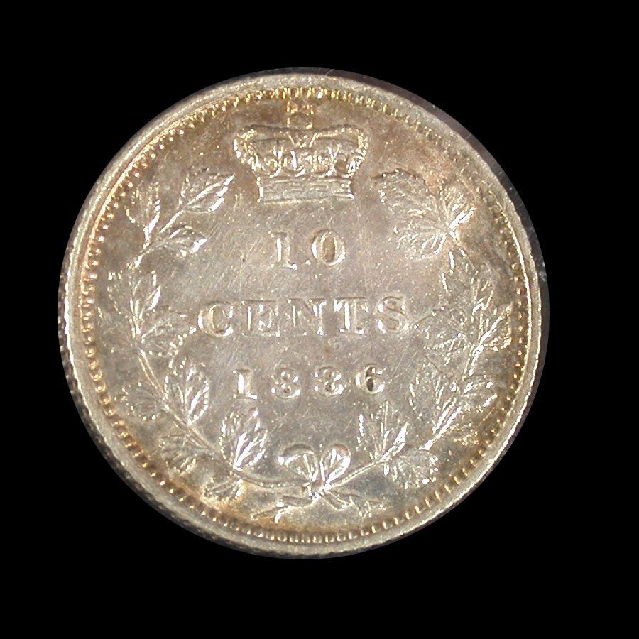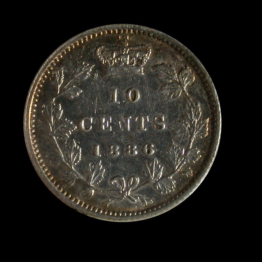 Ten Cents 1886 Large Knobbed 6, Obverse 4, ICCS EF-40, Cleaned. Now with a hint of golden toning, slightly darker around rims. NOTE: holder indicates Obverse 6, which does not exist (Trends: $750)