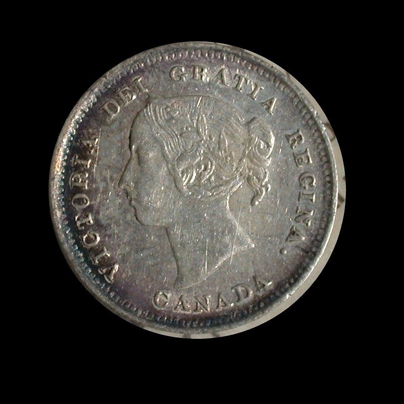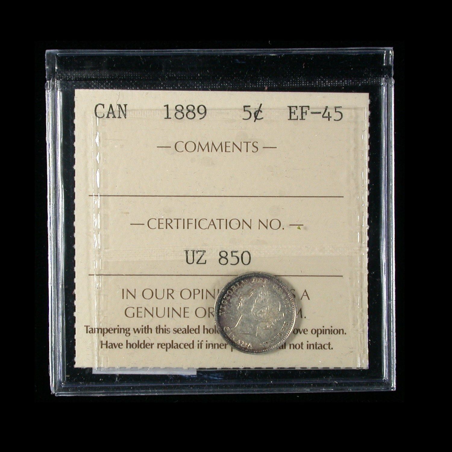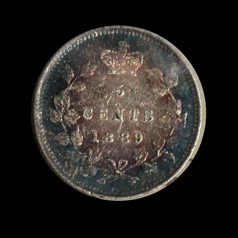 Five Cents 1889, ICCS EF-45 with quite lightly-toned obverse, medium violet-gold reverse toning with darker ring of gunmetal blue around rims