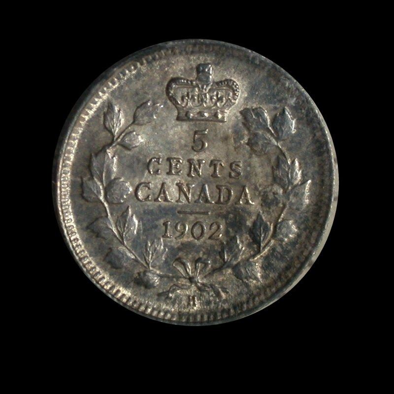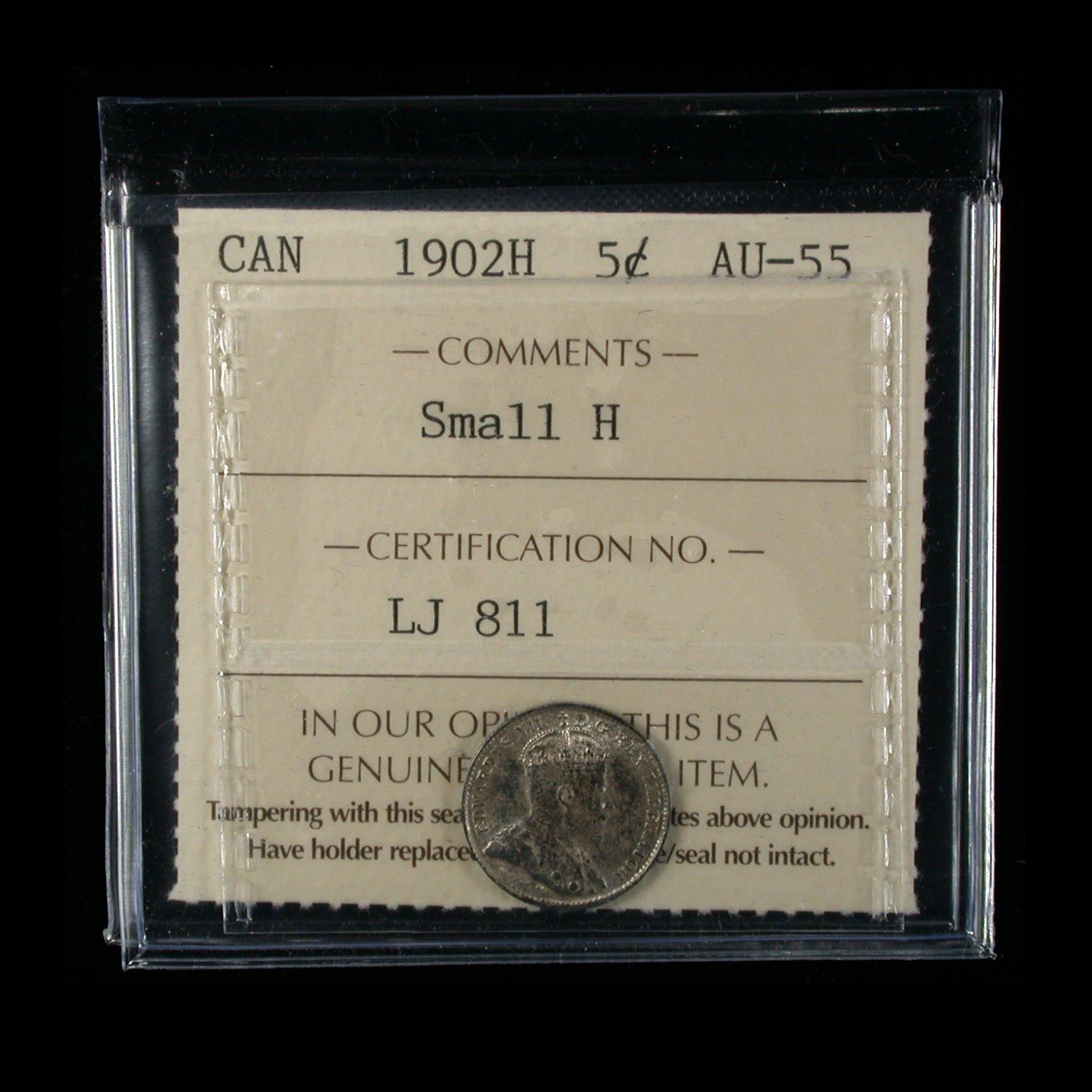 Five Cents 1902H, Small H, ICCS AU-55 with medium grey-gold toing and nice underlying lustre