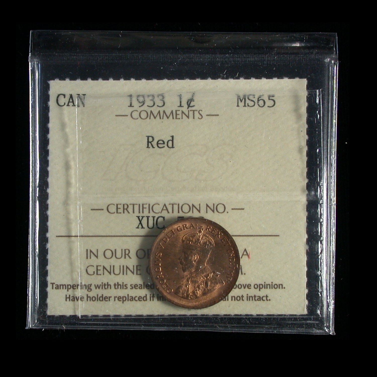 One Cent 1933 of George V, ICCS MS-65 red with nice lustre. A very challenging grade for the date