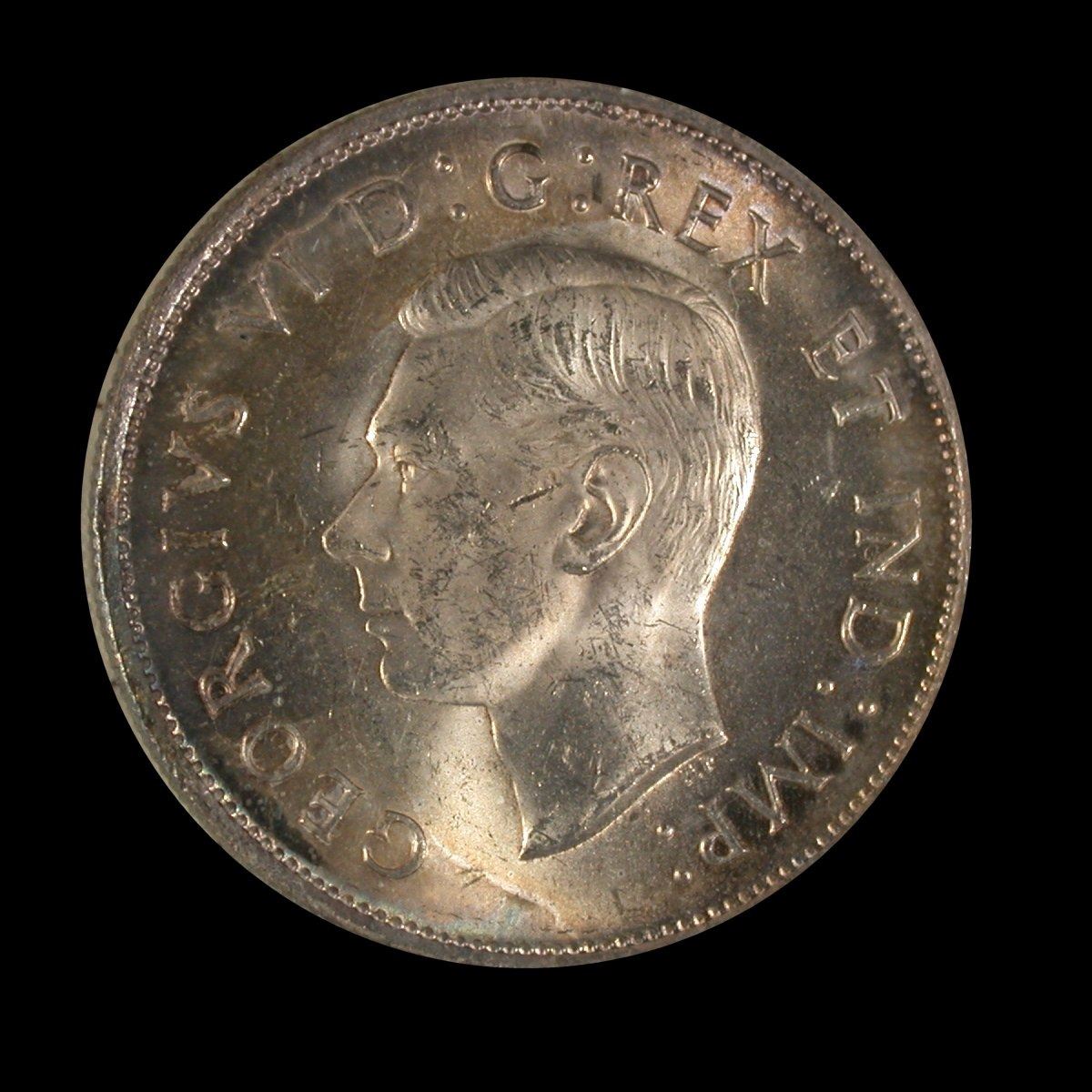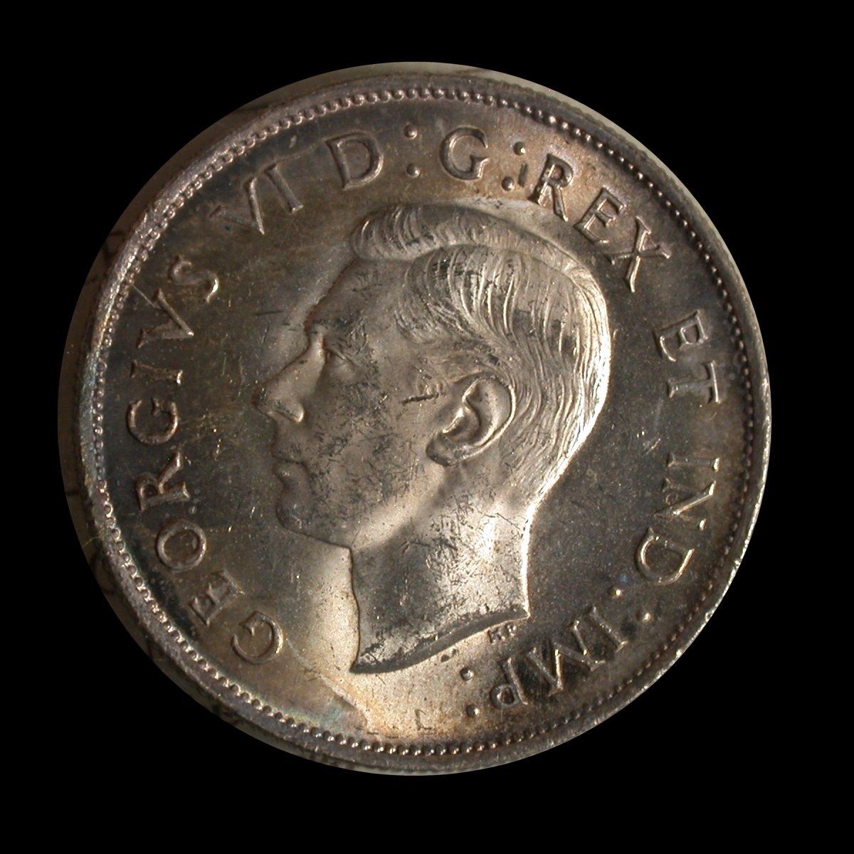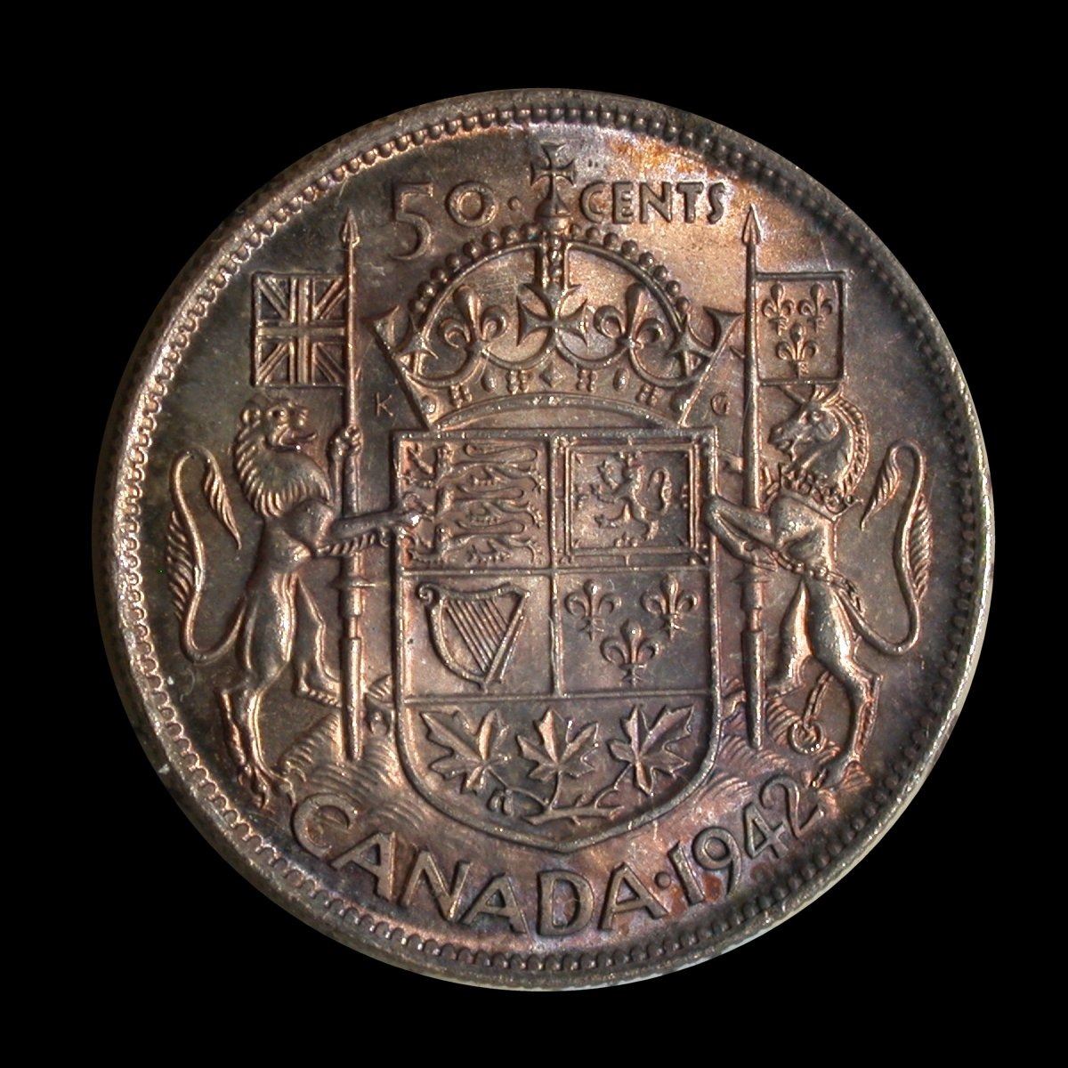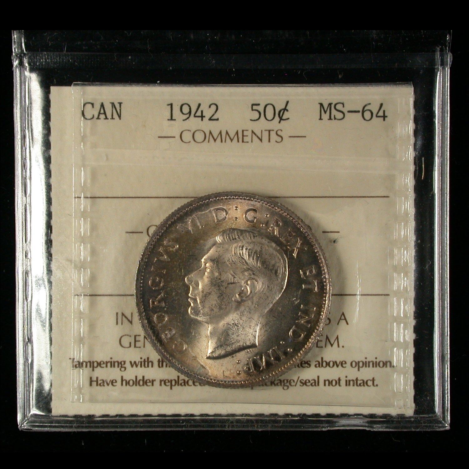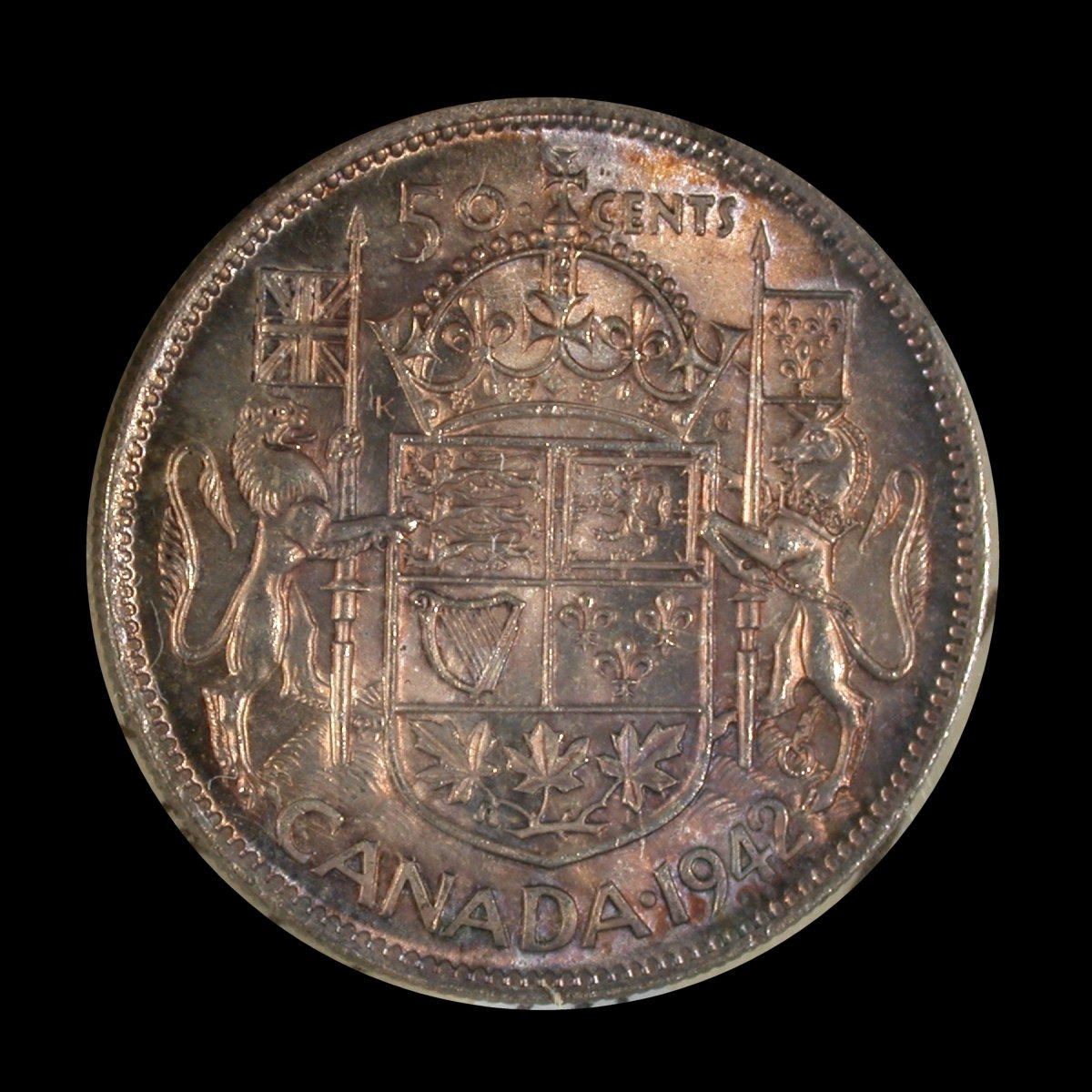 Fifty Cents 1942, ICCS MS-64 with rich golden obverse toning, slightly deeper on reverse with violet-golden hues.