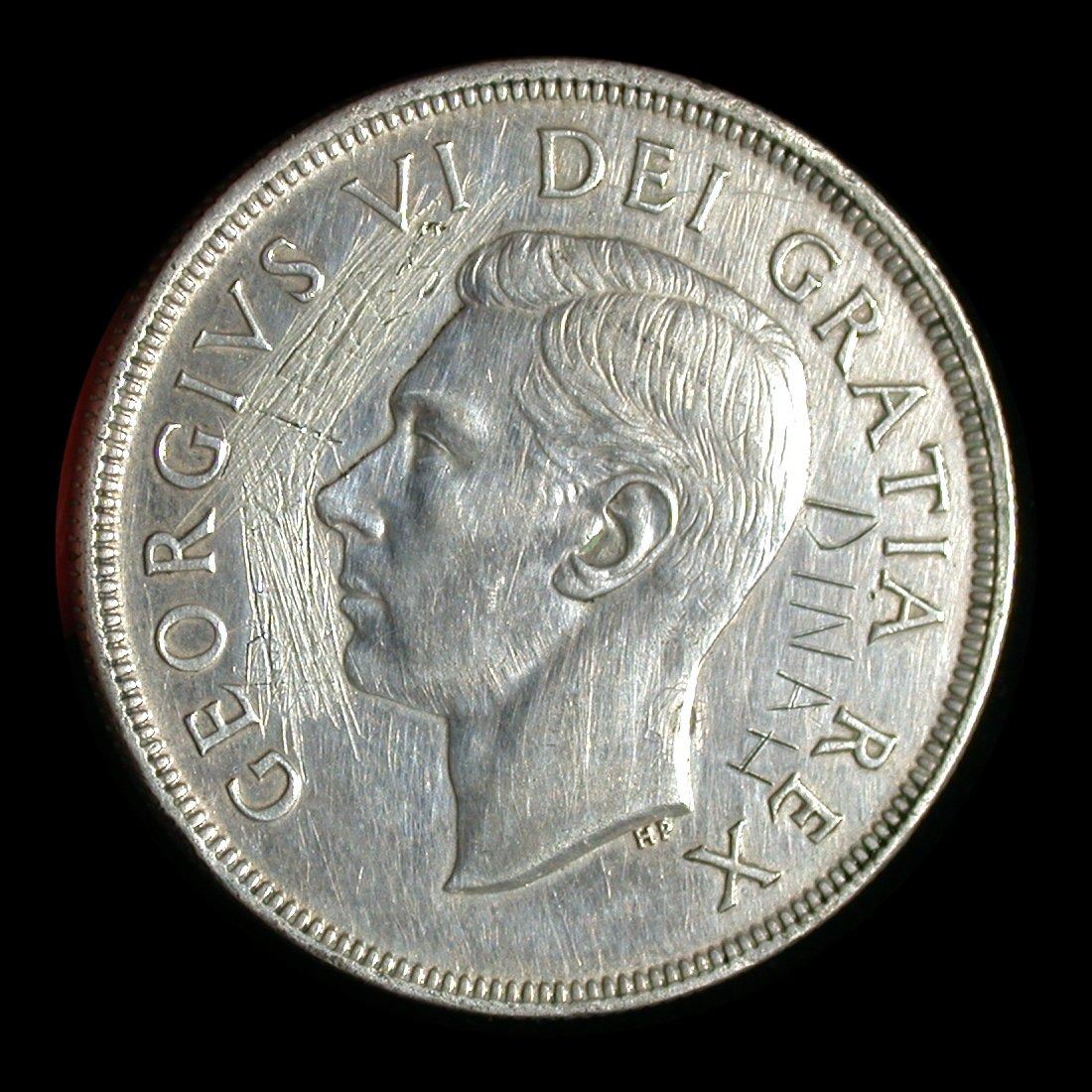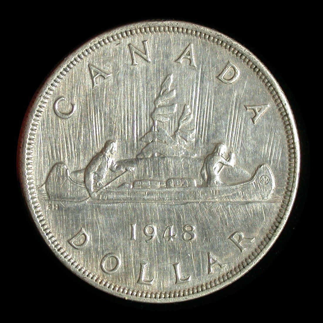One Dollar 1948, decent EF with clear hairlines from an earlier cleaning. Obverse has had graffiti engraved into fields at left and right of portrait - mostly scratched out on left, while "DINAH" remains clear at right. A unique opportunity to acquire a bargain-priced example of Canada's rarest Silver Dollar.