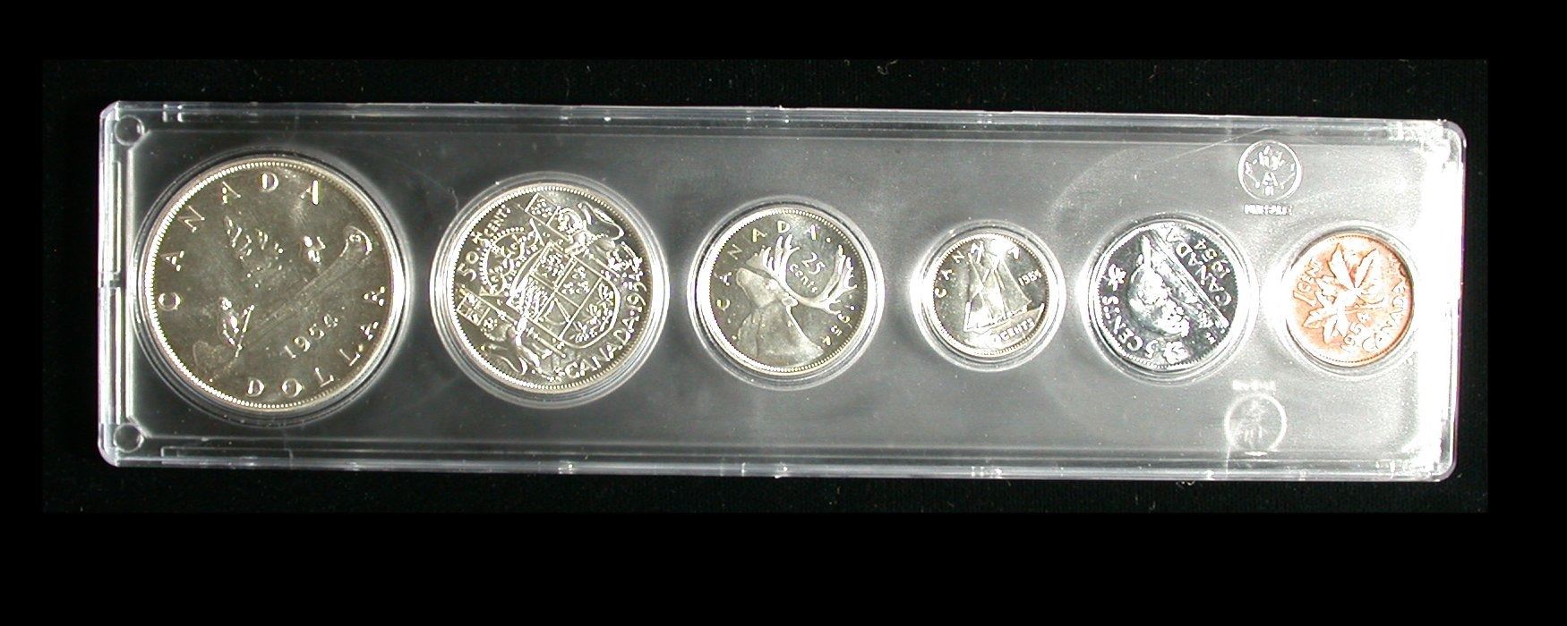 A 1954 Proof-like Set of 6 coins, Cent through Dollar, housed in a unisafe plastic year-set holder. With decent red Penny (some minor mottled toning spots), and brilliant Silver; the Five Cent coin is especially choice. A nice set!