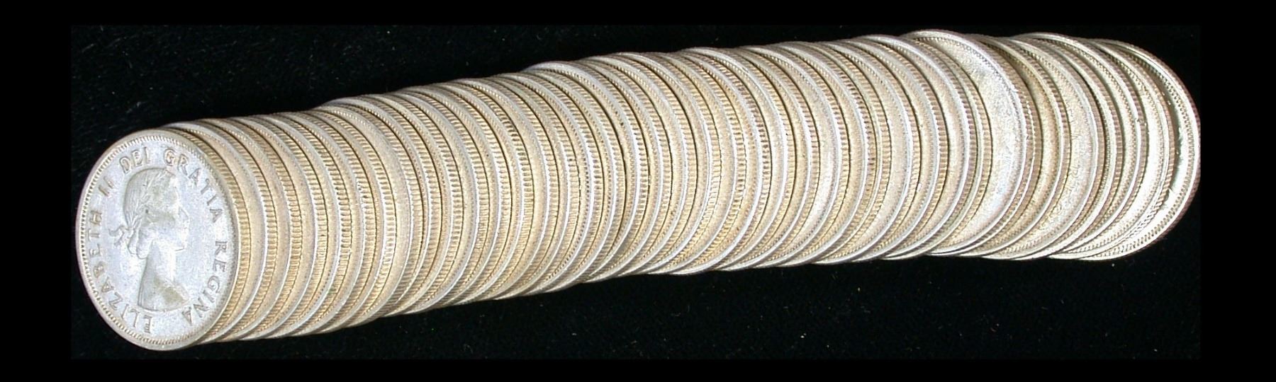 Twenty-five Cents 1954, a roll of 40 circulated coins, averaging pleasant fine, some better. An excellent lot for the flea-market dealer, and an expecially challenging date to gather in quantity