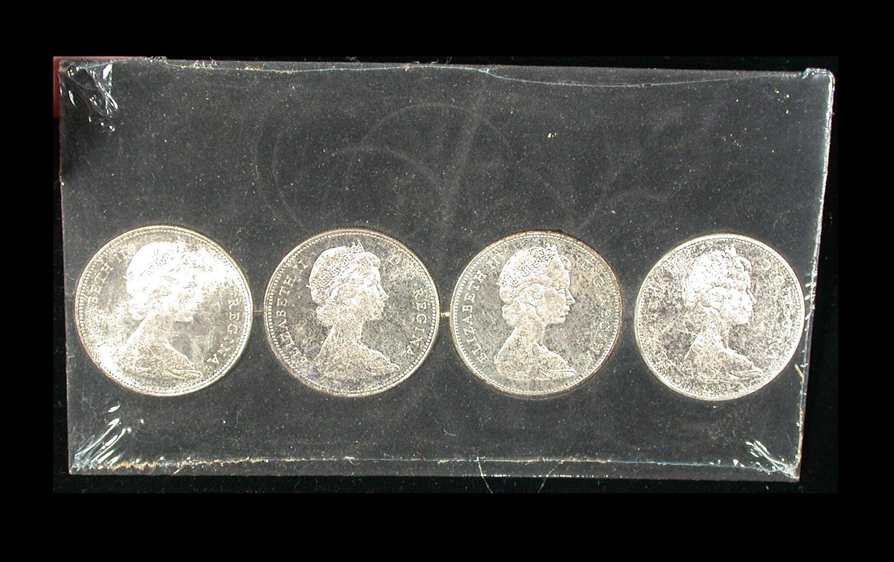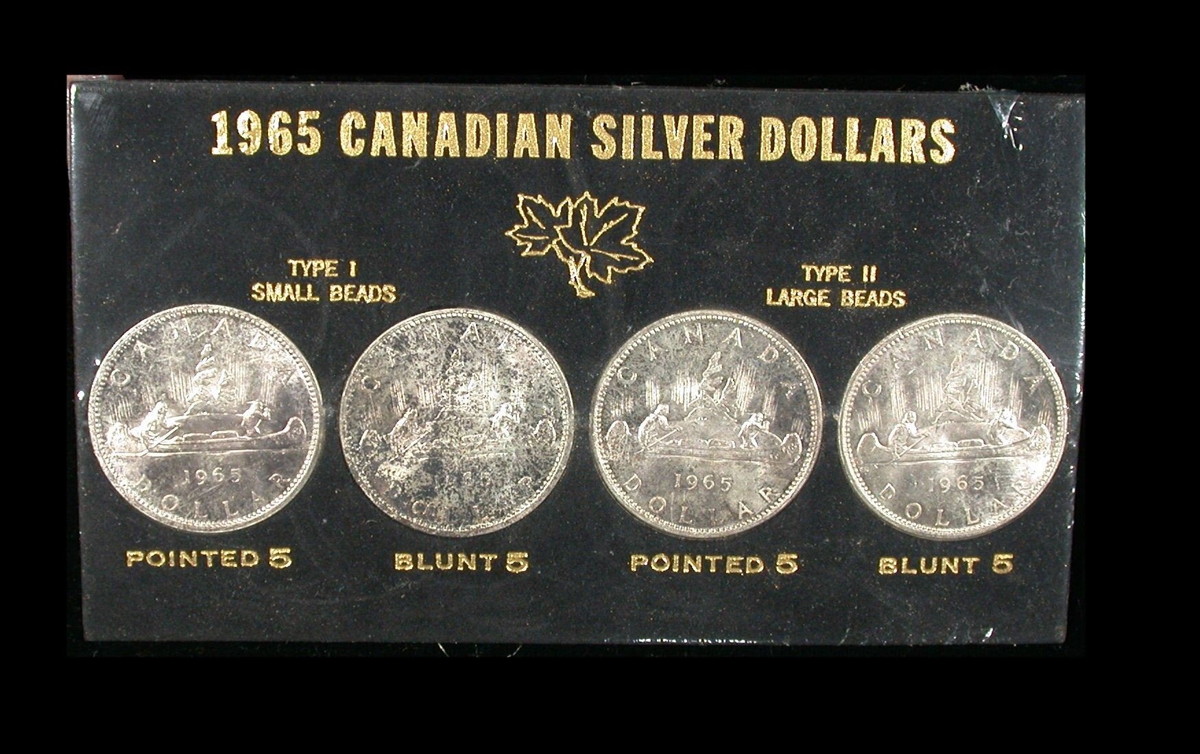 A four-piece set of 1965 Silver Dollars, consisting of both Pointed and Blunt 5 varieties of the Small and Large Beads issues, housed in an imprinted black felt display card. Are coins are nice UNC;s, with variable light toning. Set of 4 Silver Dollars