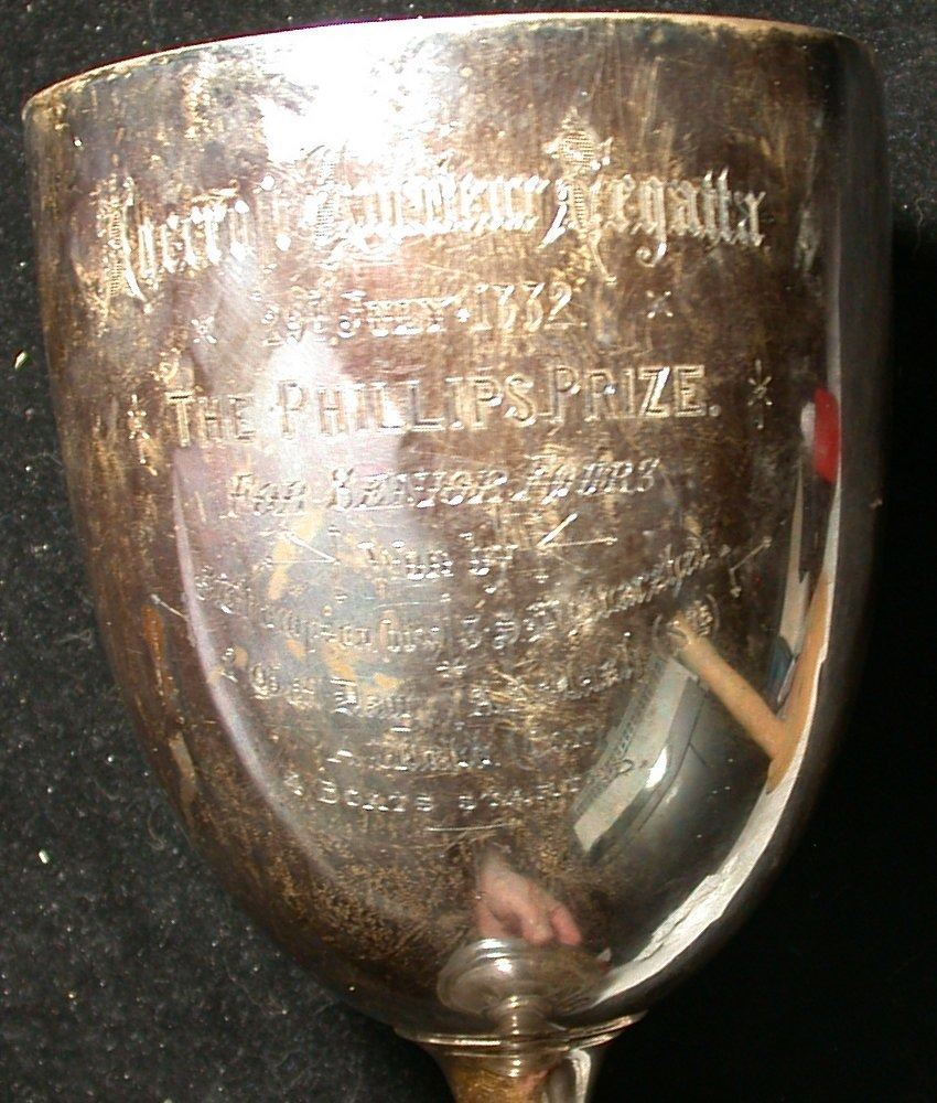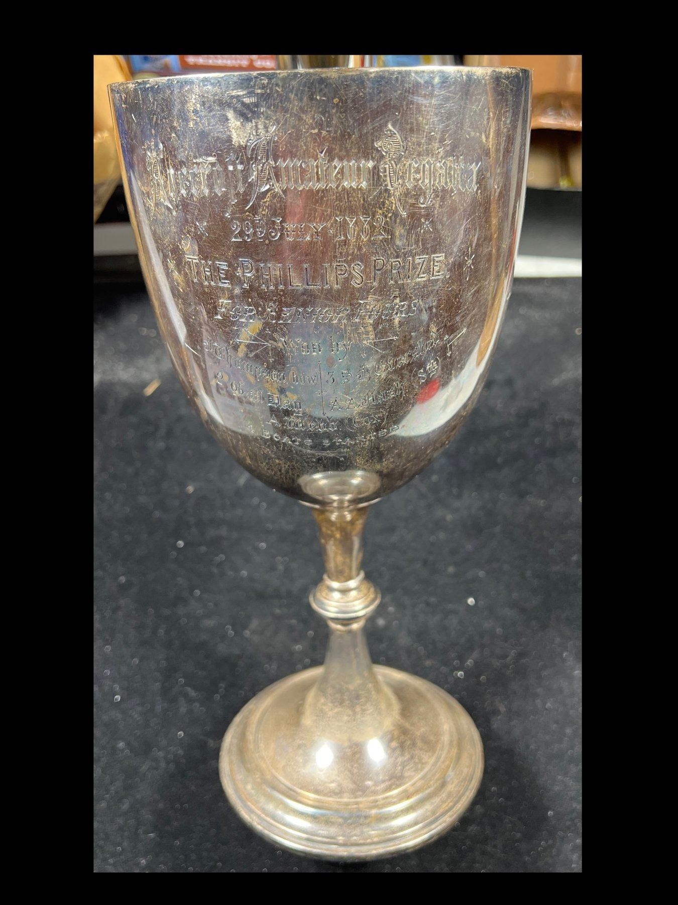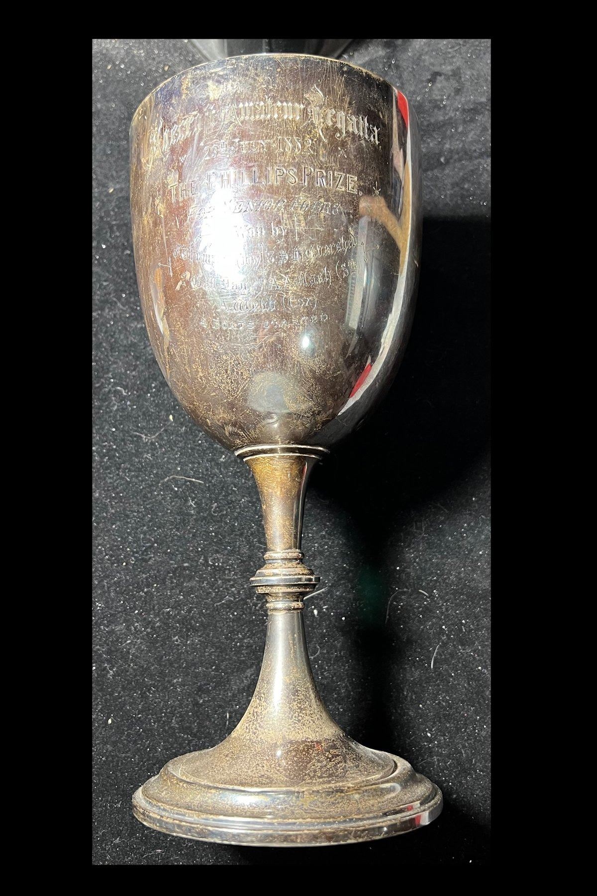 A 26 cm tall, 386 gram trophy cup/goblet, 123mm across top, with gold-gilded interior, 1879 Birmingham hallmark by Elkington & Company; nicely engraved on front with various fonts: "Agerroft Amateur Regatta / 29th July 1882 / The Phillips Prize / For Senior Fours / Won By / J. Thompson (Bow) - 3. S.H. Chershed / 2. C.M. Day(?) - A.A. Hash (S.th) / A. Webb (Cox) / 4 Boats Started". In excellent condition for the age, with or two light bruises on backp well oxidized over time, however the piece would restore to good brilliance with some dedicated elbow-grease. A nice display piece, just under 140 years old, with net silver content of 11.48 oz
