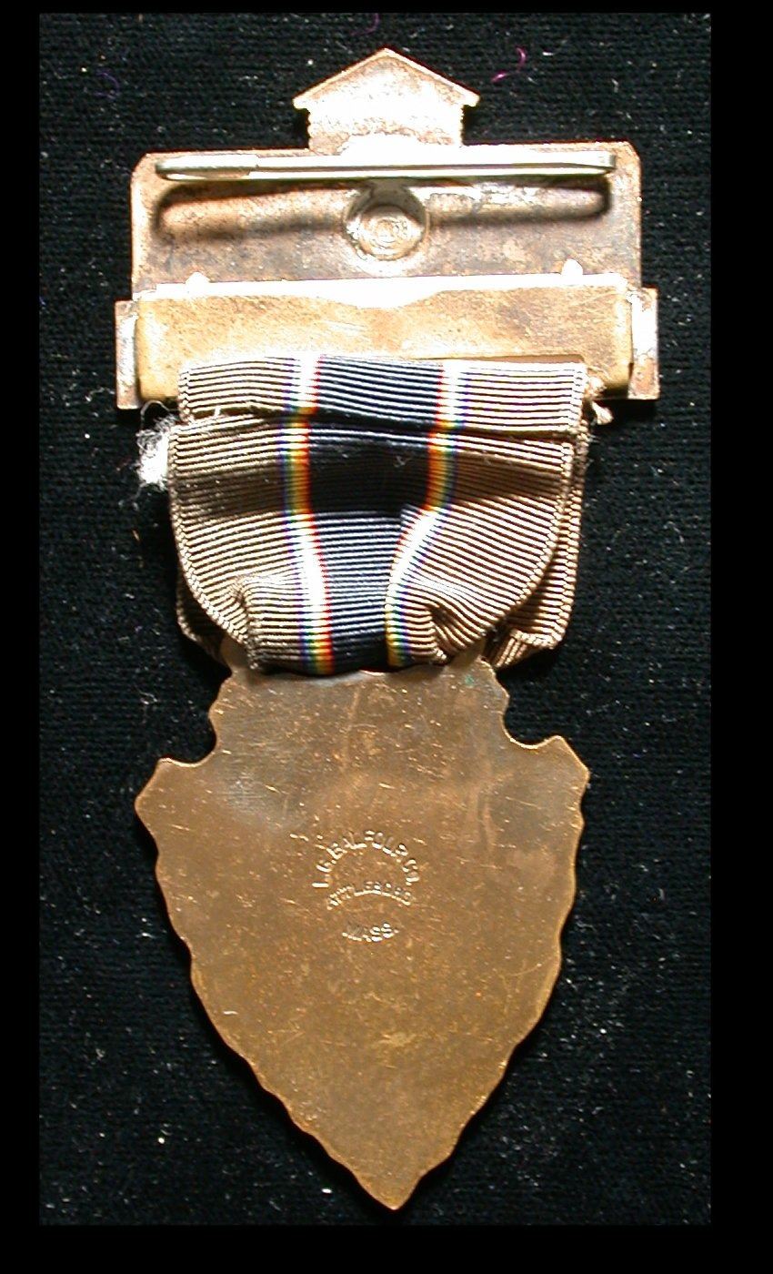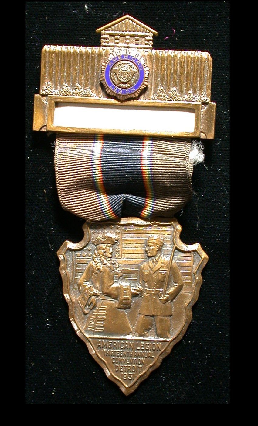 A nice arrow-head shaped brass convention medal of the American Legion, 36 x 43mm (not including ribbon and suspension-clasp), issued for the Legion's 1931 Conventon held in Detroit. Back blank, other than L.G. Balfour Company mark.