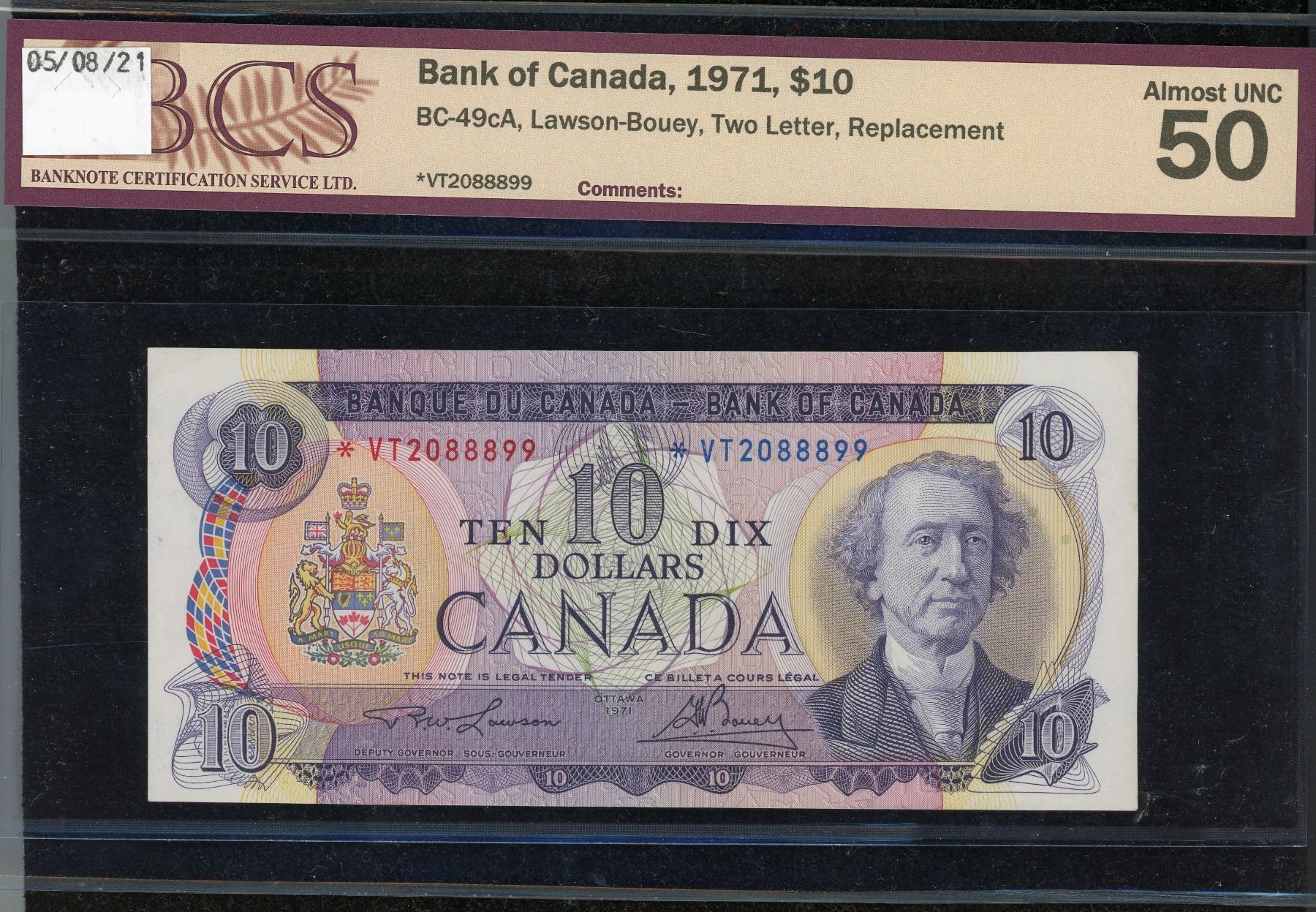 A 1971 Ten Dollar Replacement note (BC-49cA), Serial *VT2088899, BCS AU-50