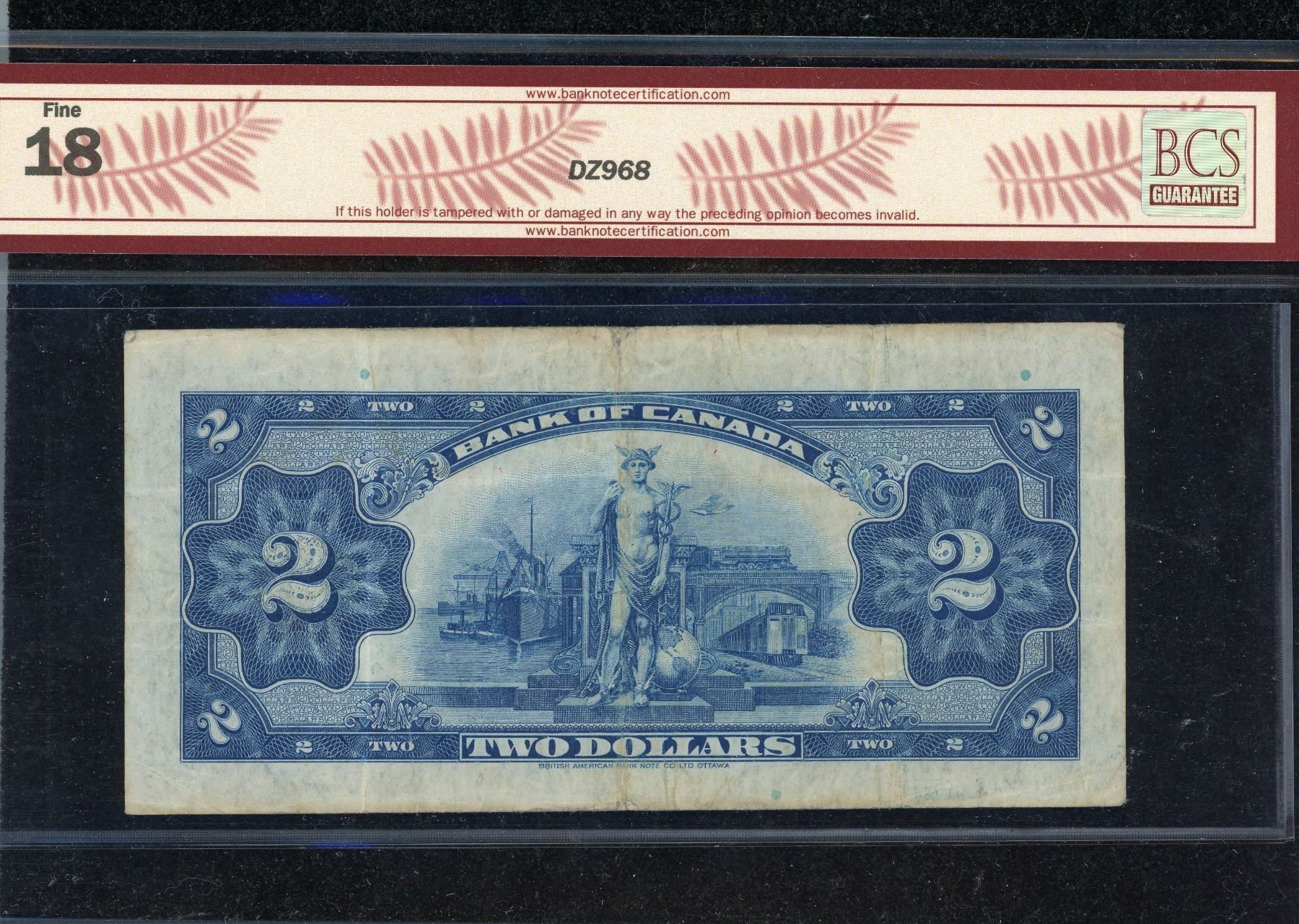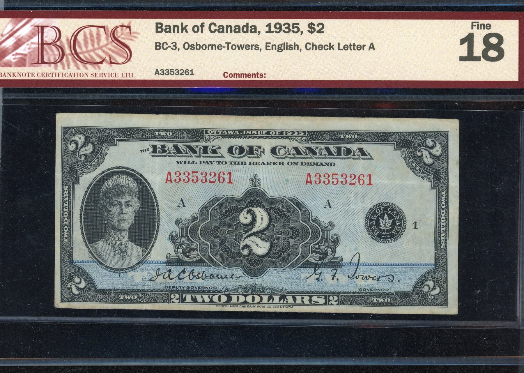 Two Dollars 1935 Queen Mary, English issue, BC-3; Serial #A3353261, BCS Fine-18