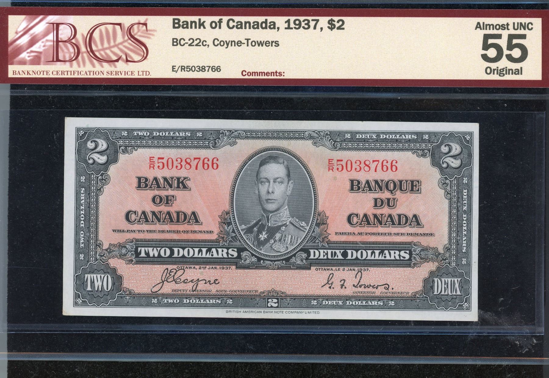 Two Dollars 1937 Coyne-Towers, BC22c, #E/R5038766, BCS AU-55
