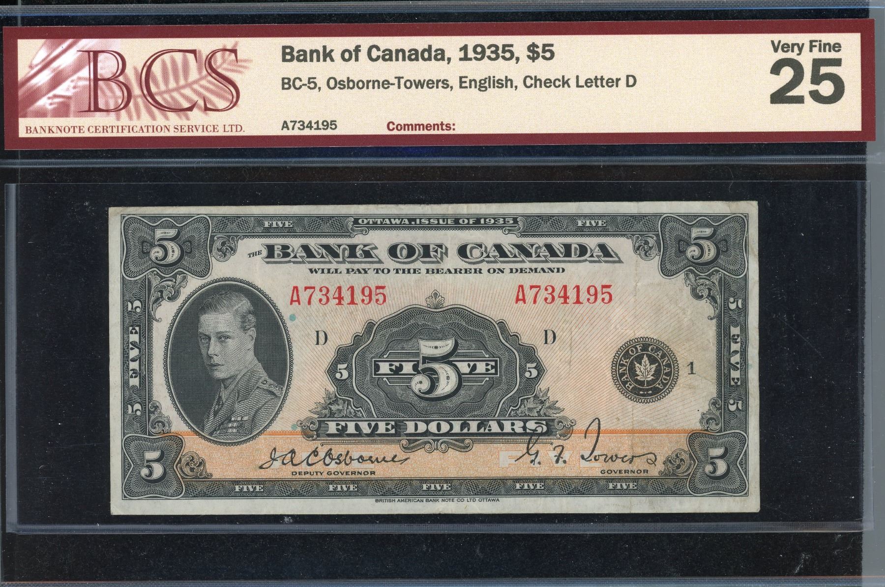 Five Dollars 1935 English issue, BC-5, Serial #734195, BCS VF-25