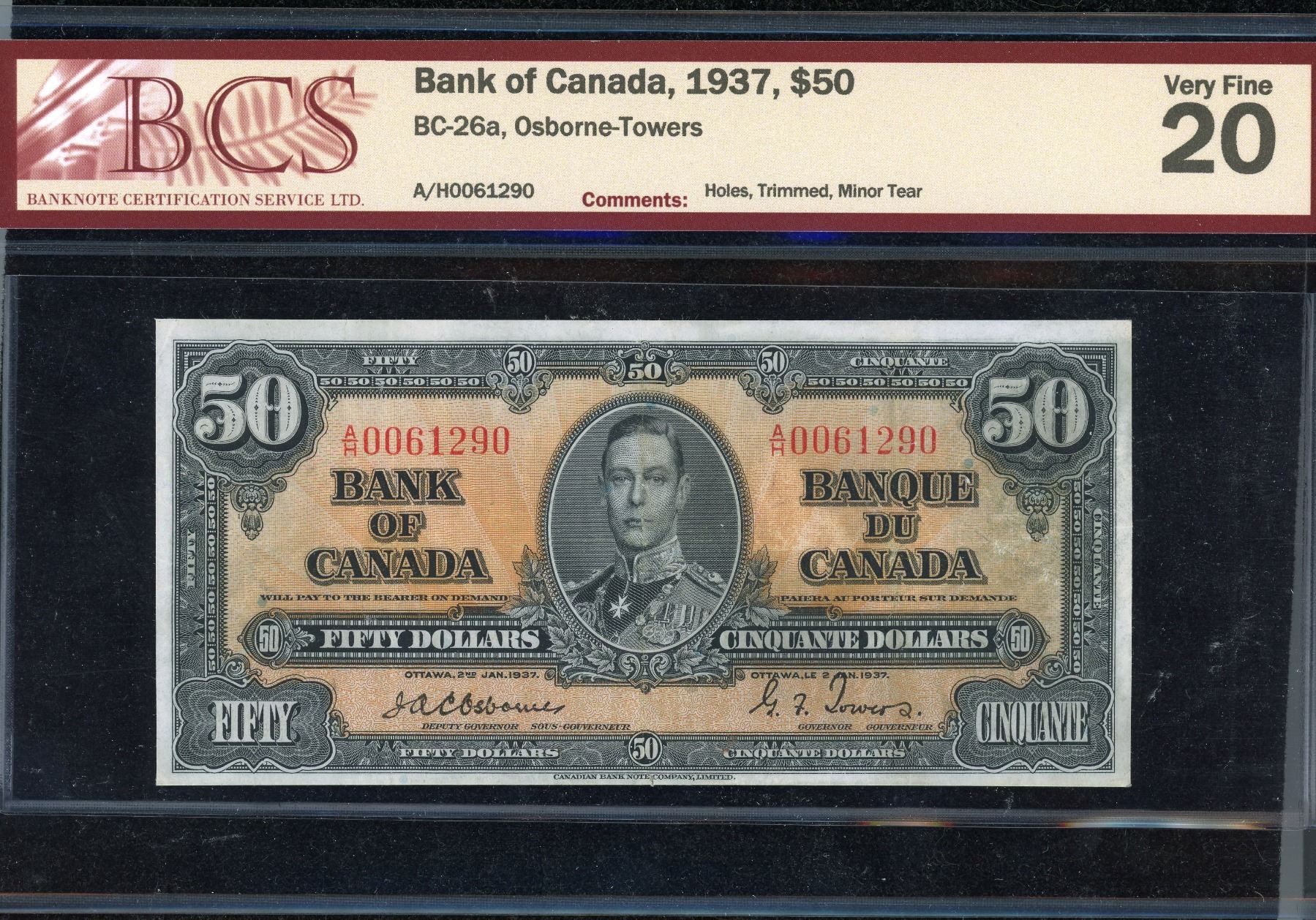 Fifty Dollars 1937 Osborne-Towers, BC-26a, #A/H0061290, BCS VF-20, Holes Trimmed, Minor Tear. We are unable to detect any holes, even on close scrutiny; note remains a clean and pleasant example of this scarcer signature