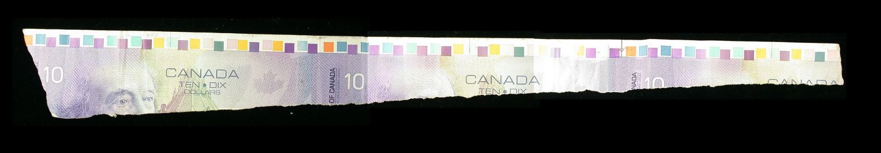 A most unusual 41cm wide margin strip from the top of a sheet of 2001 issue "Journey" Ten Dollar notes (BC-63), with tapered height from left to right of 45mm to 22mm, full colour-test bar remaining in place. VF overall with multiple creases, and an excessively-scarce item for the true banknote enthusiast.