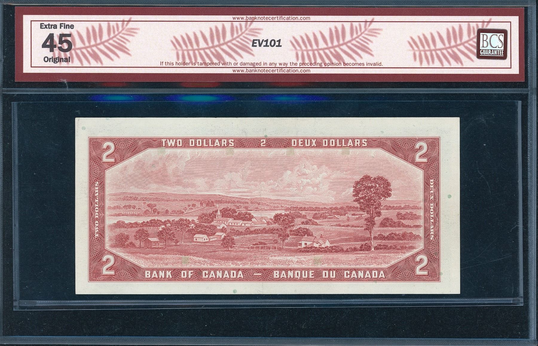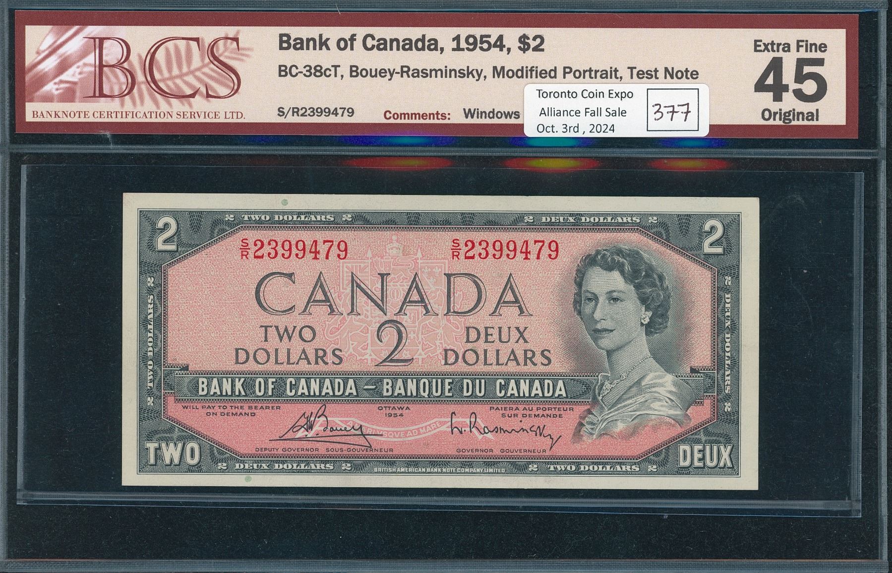Two Dollars 1954 Bouey-Rasminsky (BC-38cT), Serial #S/R2399479, a Test Note printing on rice-coated paper