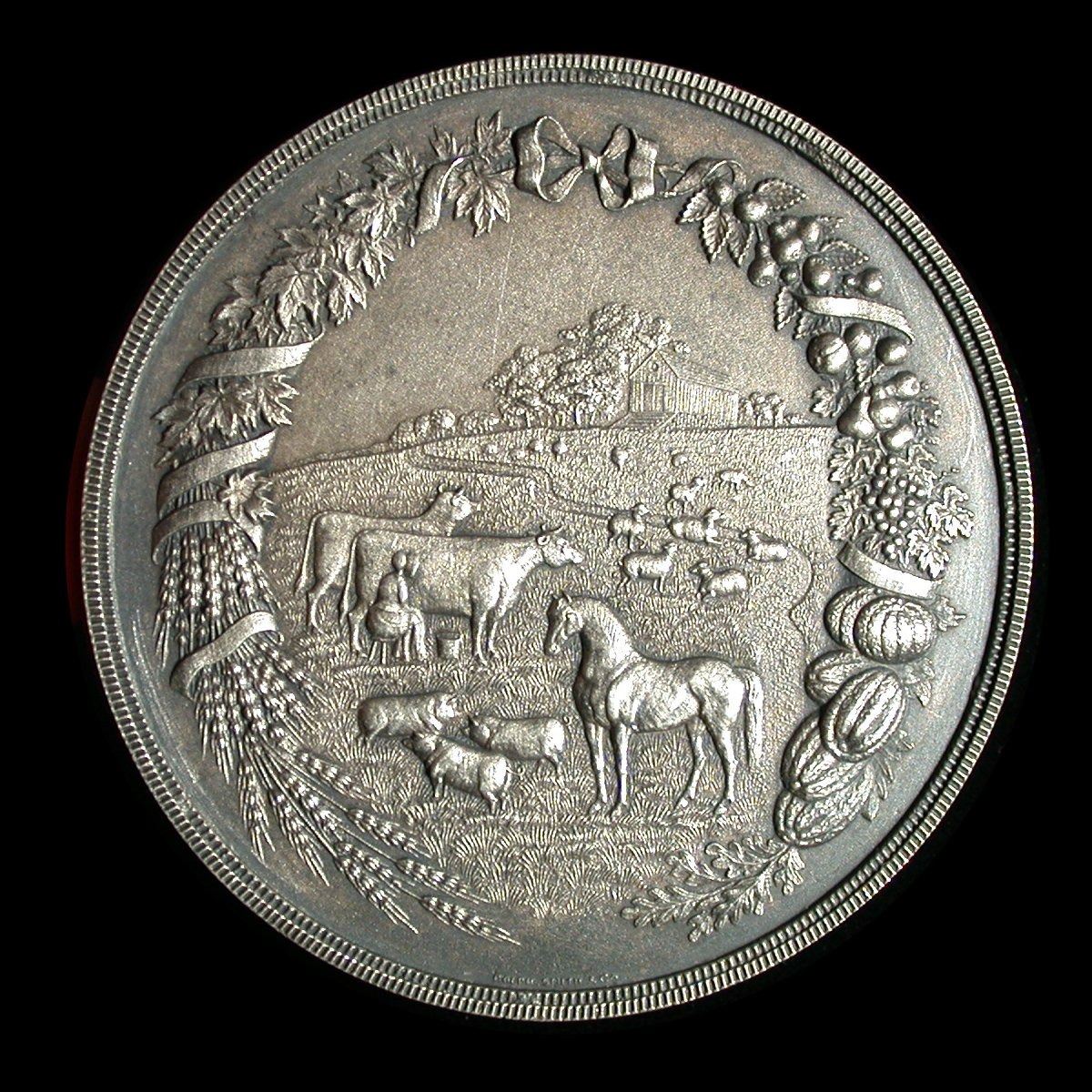 An attractive 60mm, 97.5 gram medal in fine Silver by Rolph, Smith and company, awarded by the Canadian Bank of Commerce to Miles Brinkley, "For Pair of Two Year Old Steers / at / Freelton Central Fair / 1905". Rev: engraved at sunken center, "The Canadian Bank of Commerce" around circumference in raised text; Obv: pastoral scene wth horses, cows and pigs, etc. With finely-pebbled antiqued finish, condition virtually as awarded.
