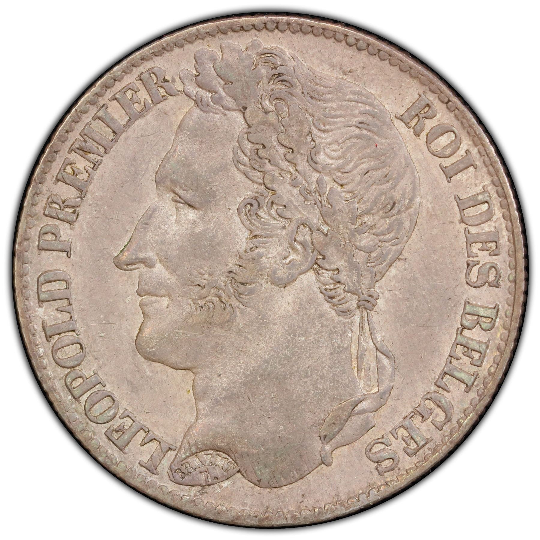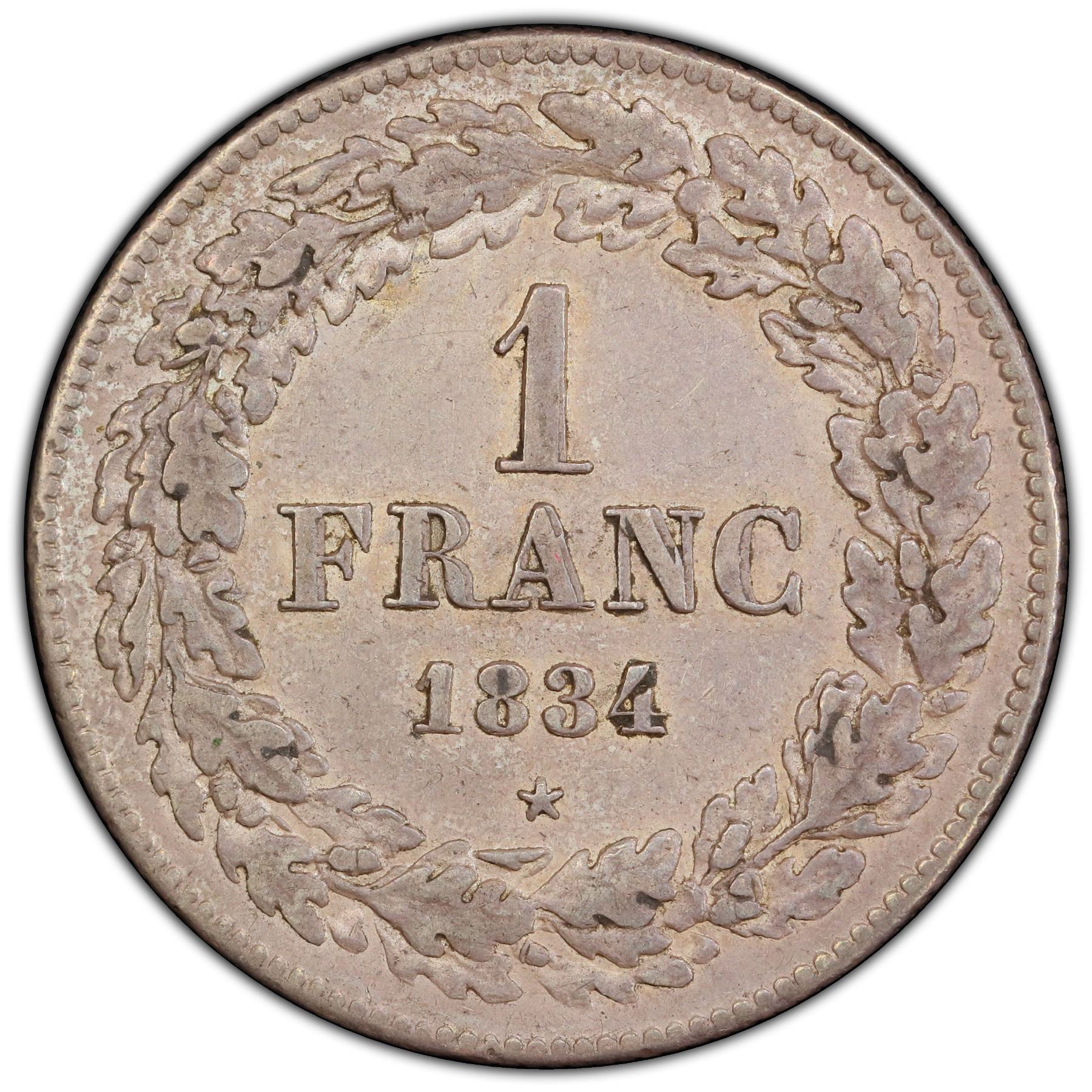 Belgium One Franc 1834 of Leopold I (KM.7.1), PCGS AU-55 with light even grey toning. A challenging coin in these higher circulated grades