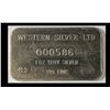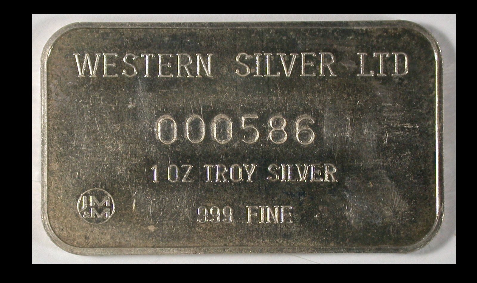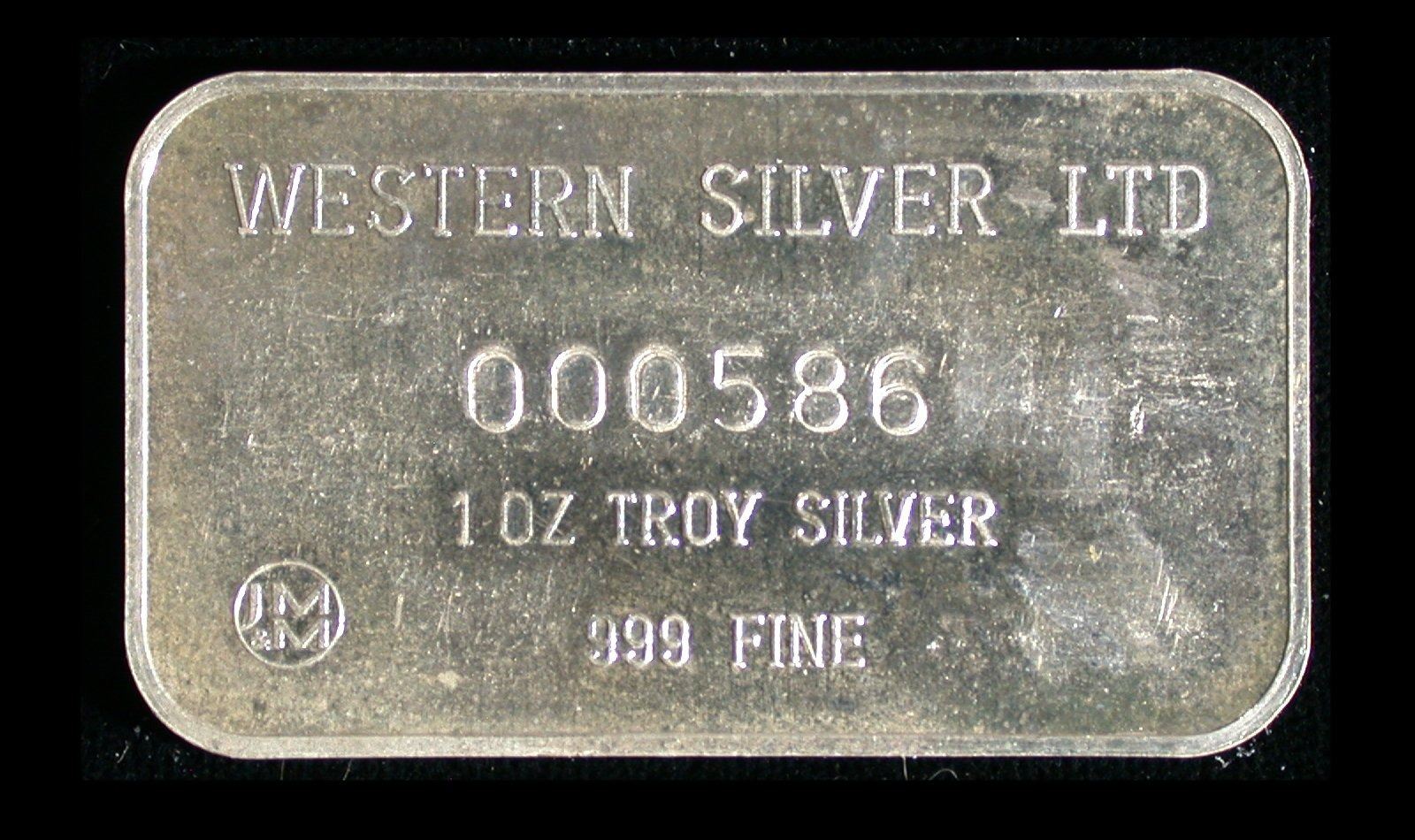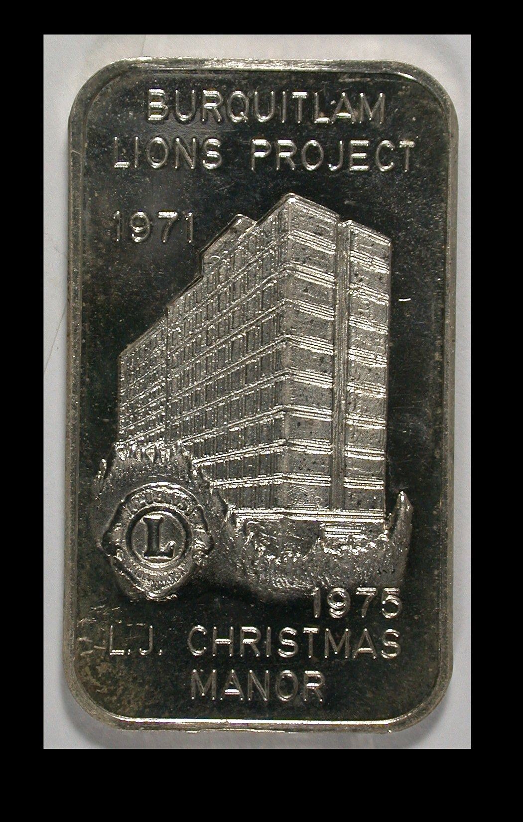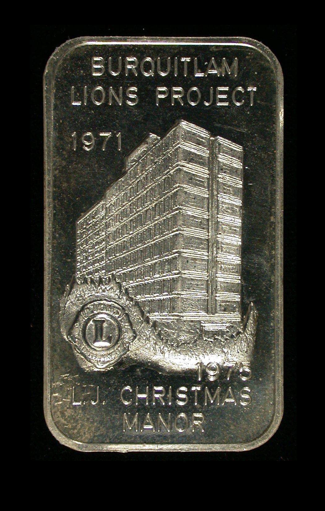 A one ounce .999 Silver bar struck by Johnson Matthey & Mallory, issued by Western Silver Ltd. in 1975 to commemorate the Burquitlam (British Colombia) Lions Project. Rev: [vertical format] multi-storey building at center, "Burquitlam / Lions Project / 1971" above, Lions crest at lower-left, text below "1975 / L.J. Christmas Manor". Obv [horizontal format] "Western Silver Ltd" at top, serial number 000586 below, in further two lines of text: "1 oz Troy Silver / .999 Fine", finally with small JM&M logo within circle at lower left. The first example of this bar we've seen, nice UNC with minor scuffing of obverse fields. (This item is HST exempt)