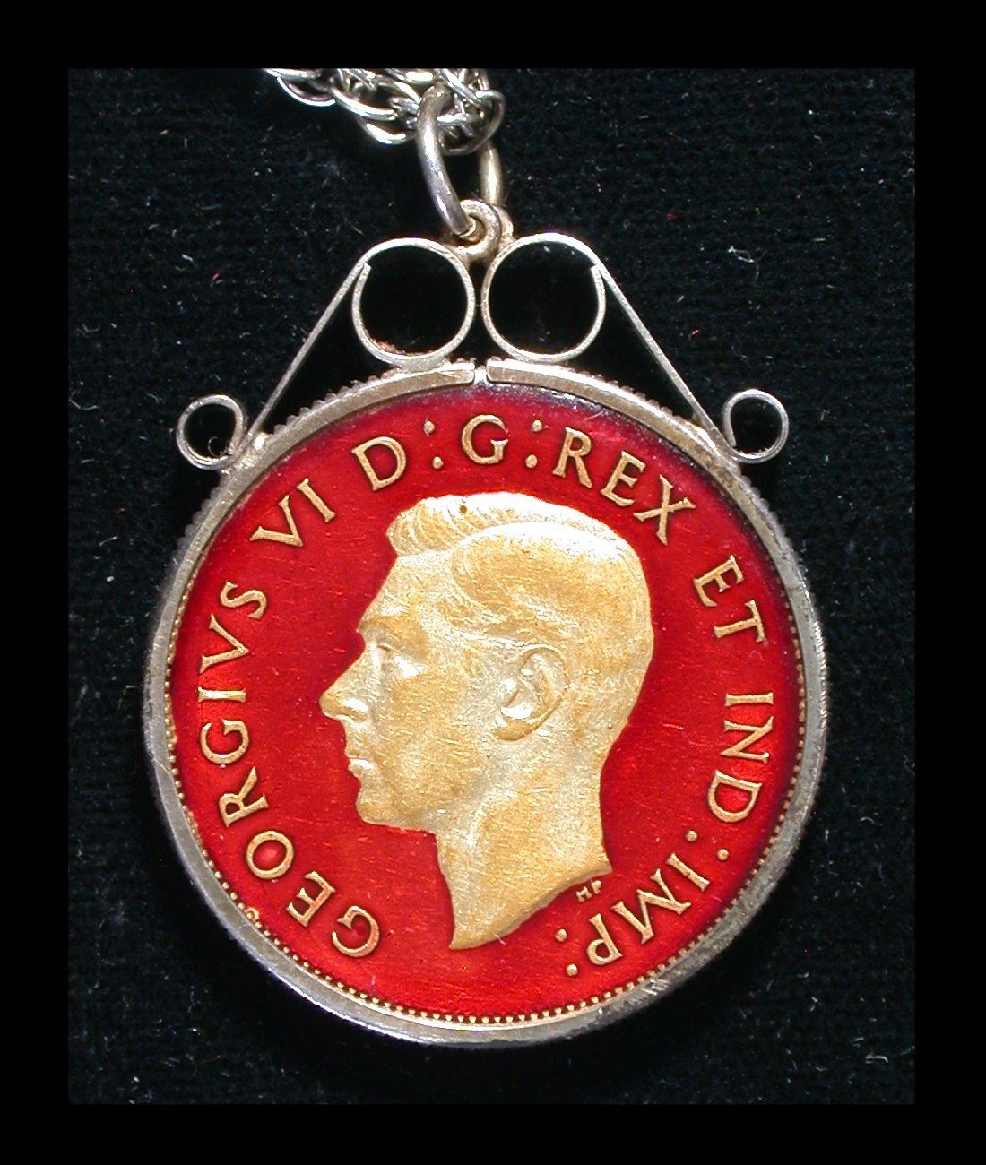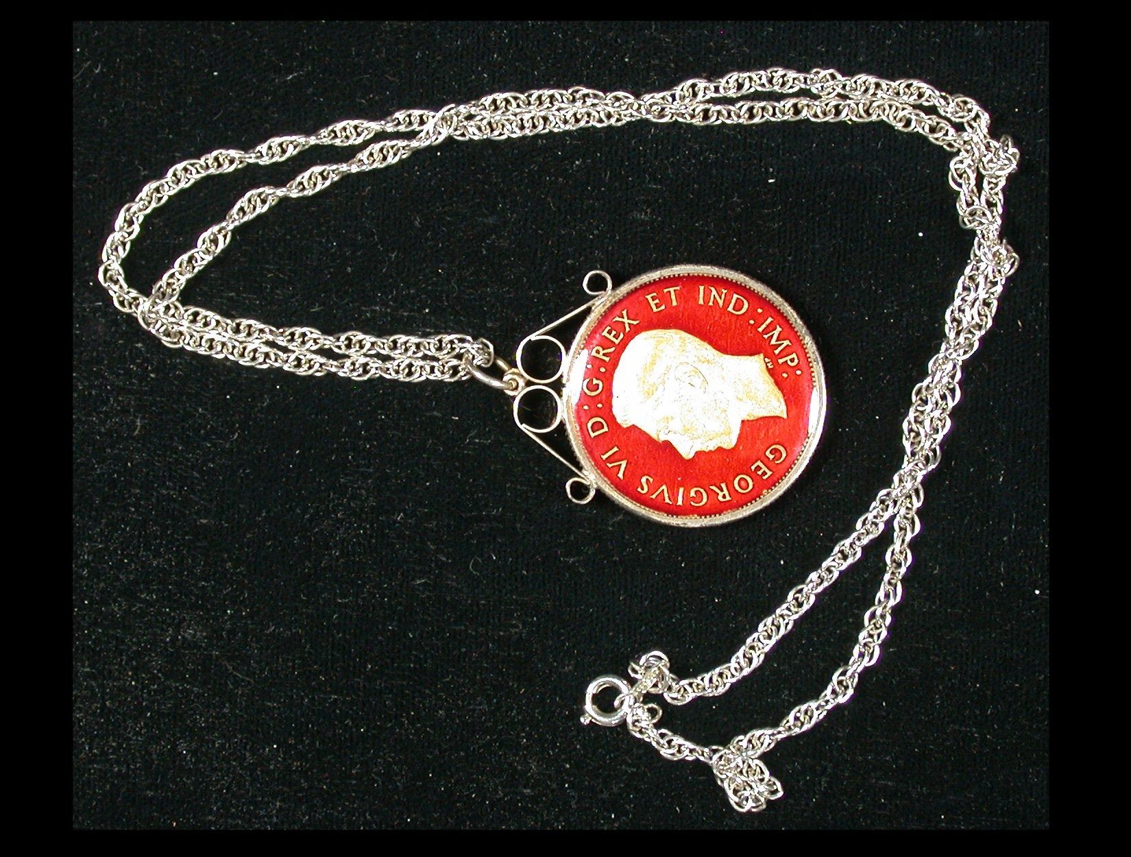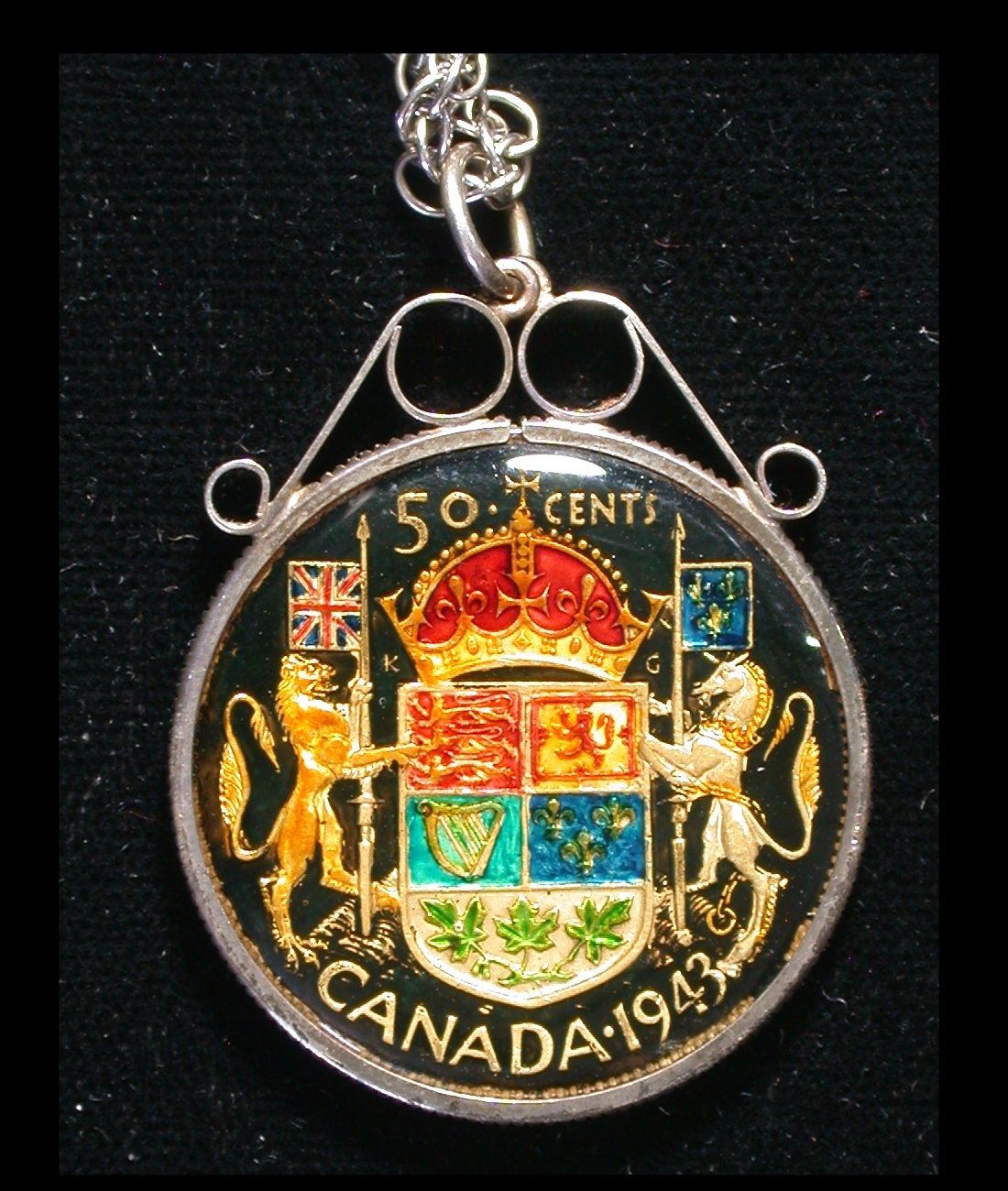 An attractive 1943 Canadian Half Dollar that has been decorated with full multi-colored enamelling, and then encapsulated in a custom sterling suspension bezel, with accompanying 11" brilliant Sterling Silver chain.
