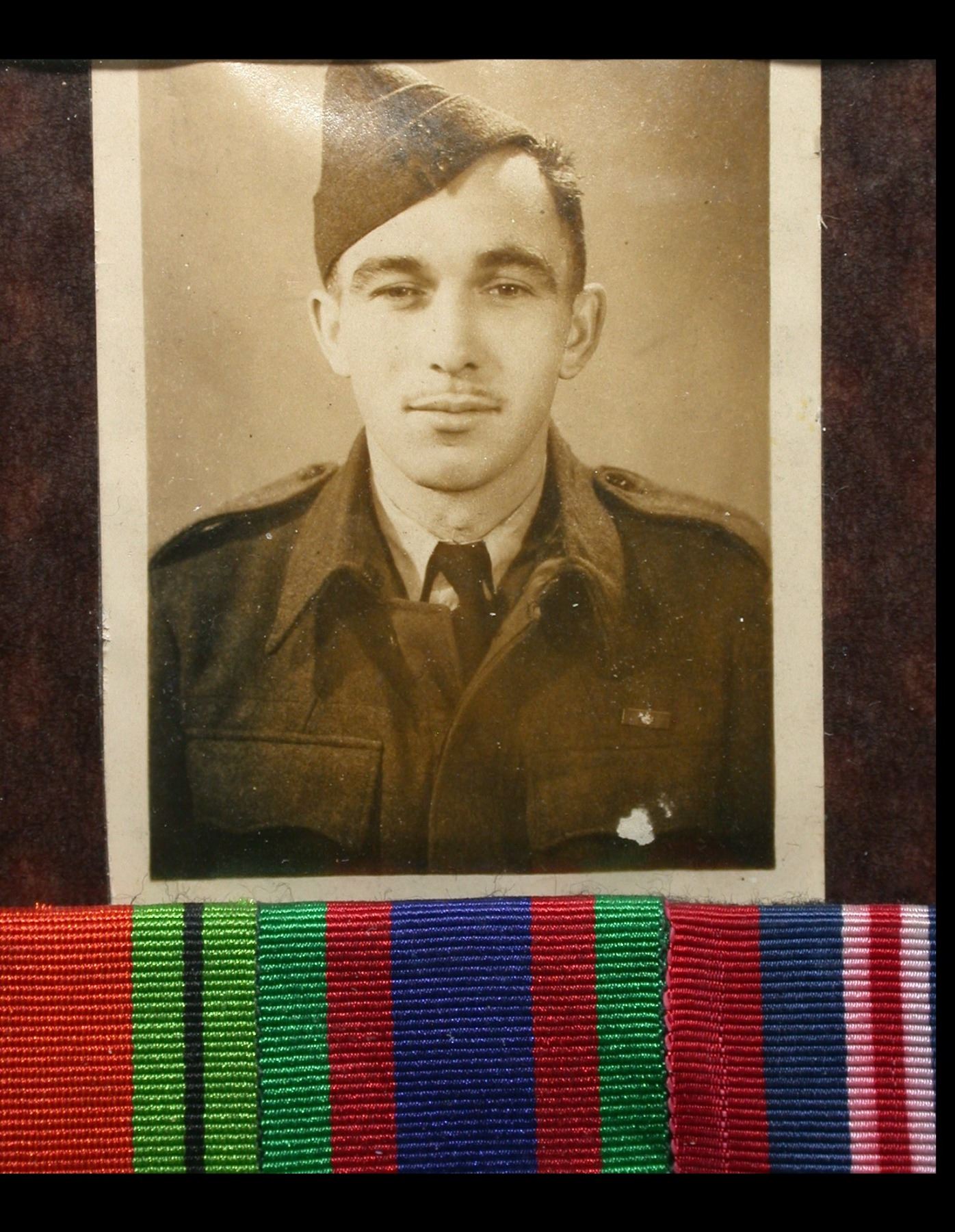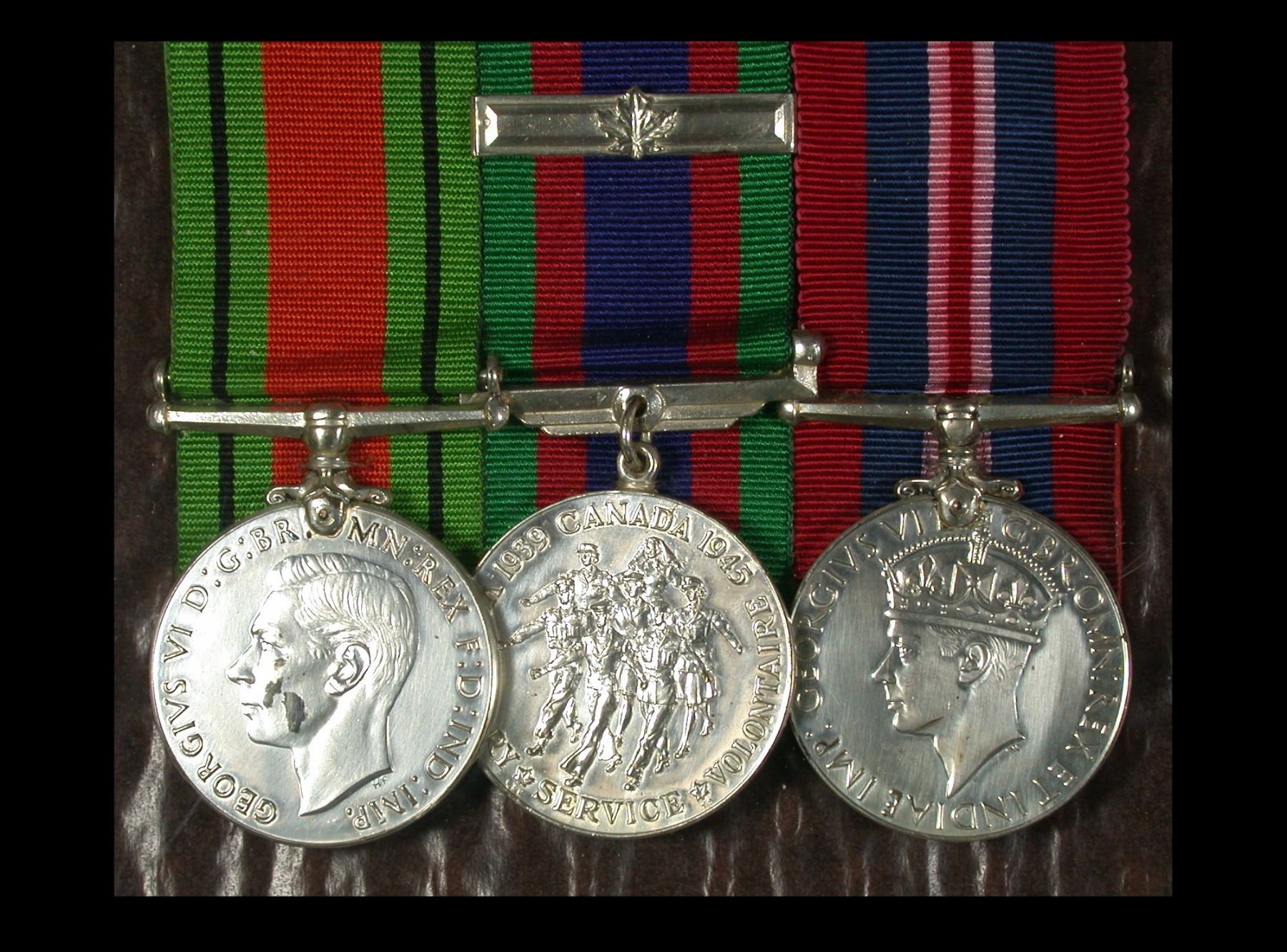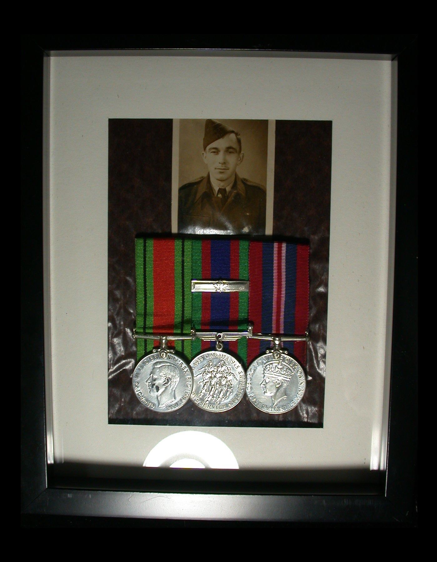 A framed court-mounted trio of WWII service medals, consisting of: Defence Medal, 1939-45 War Medal, and Canadian Volunteer Service Medal with Maple Leaf clasp. Housed in a 9 x 11" black frame, with a black-and-white photograph of the recipient displayed above the medals (identified only as "Gerald", together with date of January 20th, 1945 on the back of the photo)