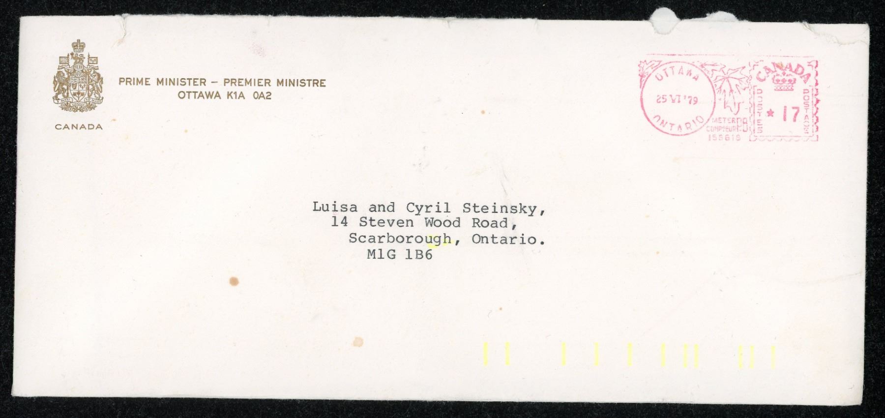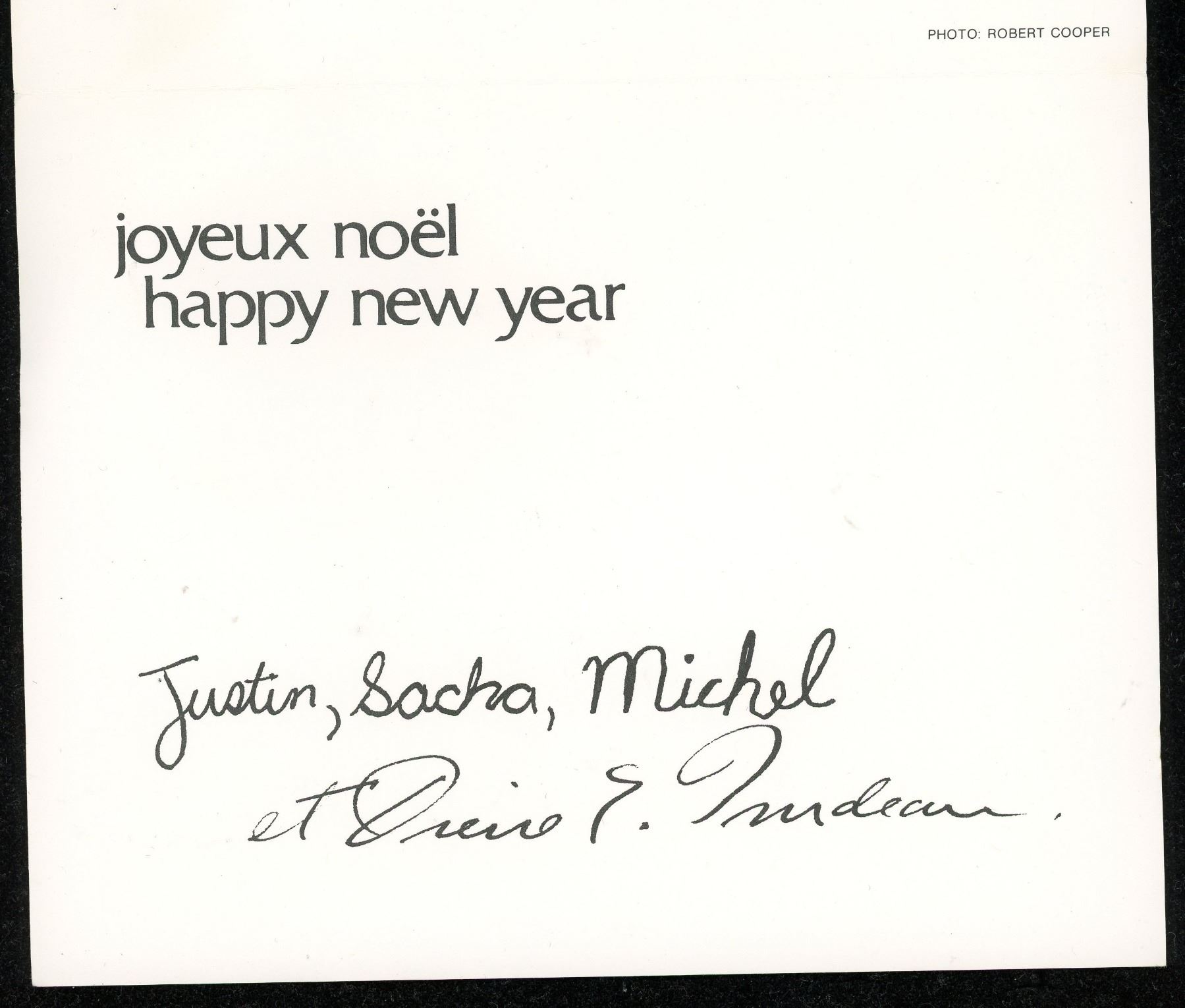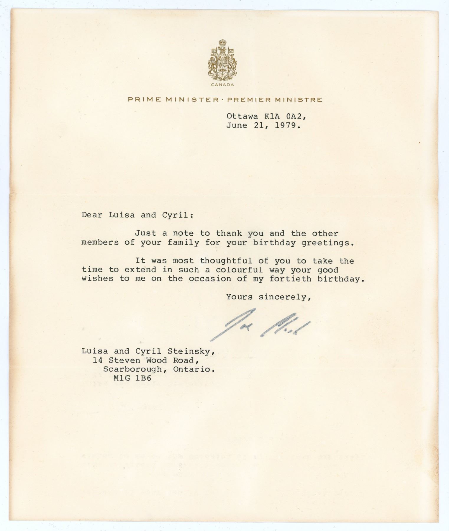 A lot of two items involving Canadian Prime Ministers, as follows: an 18 X 14cm folded Christmas/New Years card with family portrait of Prime Minister Pierre Trudeau and his 3 sons (including a young Justin Trudeau), date unknown though likely c. 1982. Offered together with a 24 X 20cm typed letter dated June 21, 1979 from Prime Minister Joe Clark, on the Prime Minister's letterhead with matching envelope, thanking an Scarborough couple for their birthday wishes. Signed by Joe Clark, although presumably a printed rather than hand-signed signature. (Lot of 2 items)