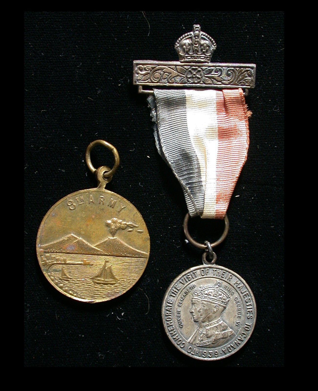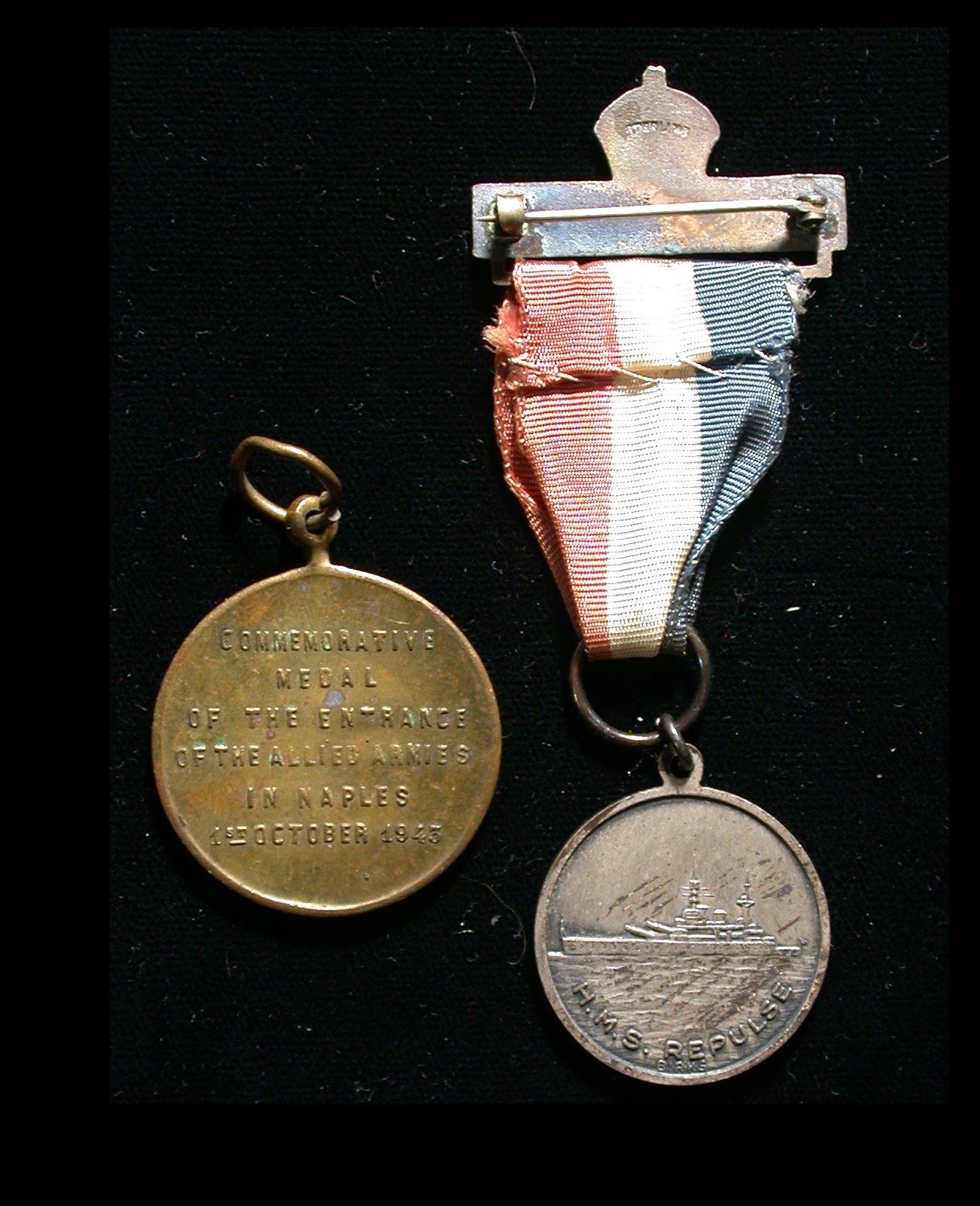 United States, a 31mm brass or bronze medal with suspension loop, issued to commemorate the 8th army, and "the entrance of the Allied Armies in Naples 1st October 1943"; Rev: areal view of a harbour, smoking volcano and second peak in the distance, pair of saling craft in the foreground; Obv: text, as per above. Offered together with a 26mm plated Sterling Silver 1939 Royal Visit medal by Birks, Rev: left-facing conjoined portraits of King George VI and Queen Mary, text around rims: "To Commemorate the Visit of Their Majesties to Canada 1939"; Obv: Battleship at sea, "H.M.S. Repulse" around bottom rim. suspended on a 35mm red, white and blue striped ribbon, with crowned Sterling Silver supension clasp at top. Sadly, the Repulse would be sunk by the Japanese two years later, off Malaya. (Lot of 2 medals)