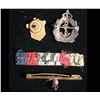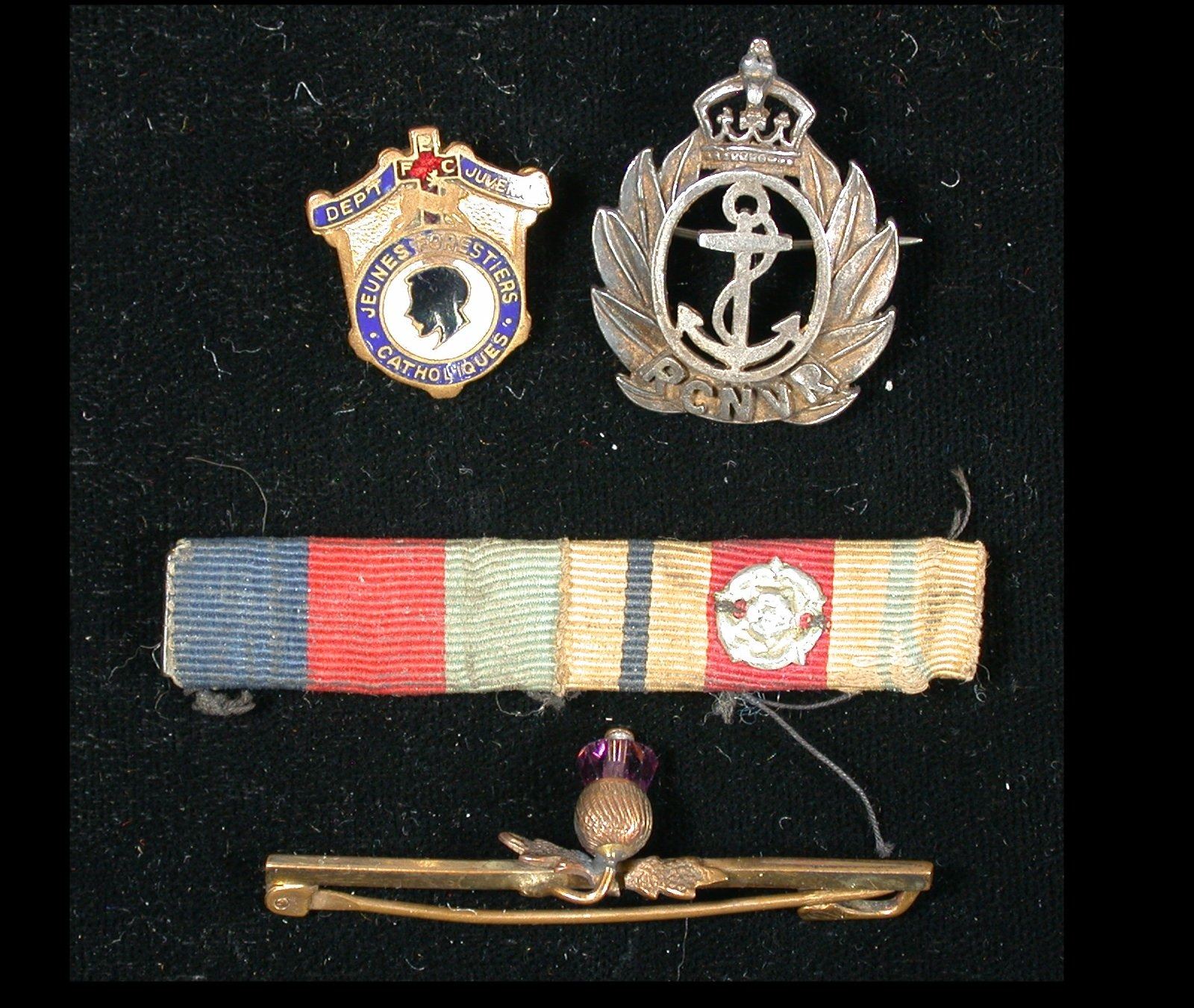 An Allied Victory Medal and 1914-1918 War Medal pair, both impressed to: "145543 PTE. M.J. SINCLAIR 87-CAN INF. Both medals notably worn due to much apparent polishing. Offered together with a small ribbon bar with Rose pin attached, a RCNVF in Sterling Silver, a Juvenile Catholic Order of Forresters brass pin, together with a small brass Thistle pin-on bar. Born in Perthshire, Scotland, Mungo James Sinclair enlisted in late November of 1915, listing his current address as Kenmore, Ontario. (Lot of 5 items)