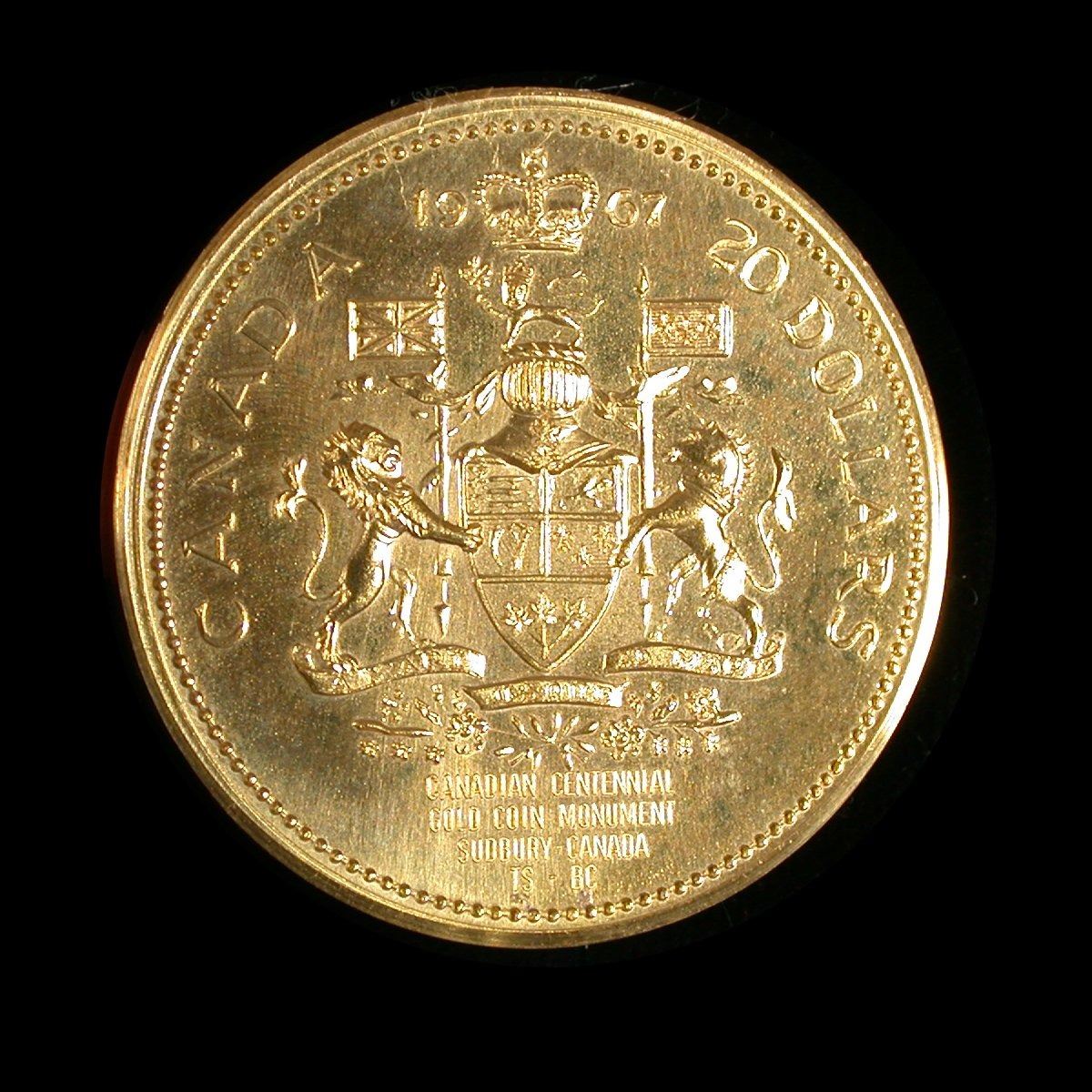 A 38mm gold-plated medal, patterned after the Canadian Centennial Gold Coin Monument located in Sudbury's Numismatic Park. Among the scarcer pieces in this medalic series, as purportedly the RCMP took issue with the close design likeness in comparison to the issued Twenty Dollar Gold sold in the 1967 Centennial Proof Set.