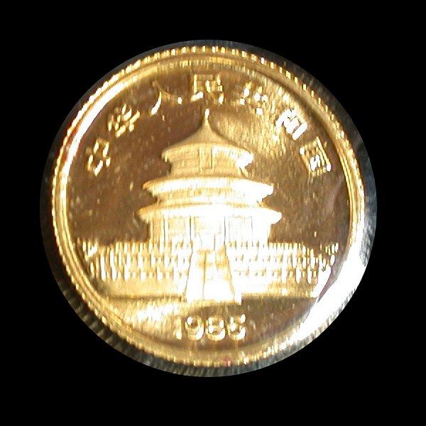 A 1/20th oz .999 Gold Panda of the Chinese Mint, dated 1985, with Panda reverse and Temple of Heaven on obverse. BU, still sealed in original plio pouch with intact ribbed seals. (this item is HST-exempt)
