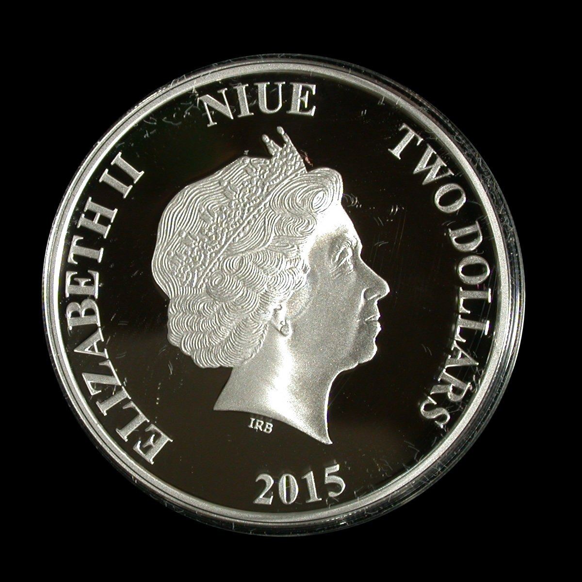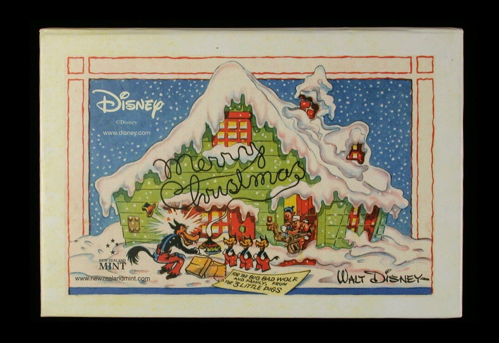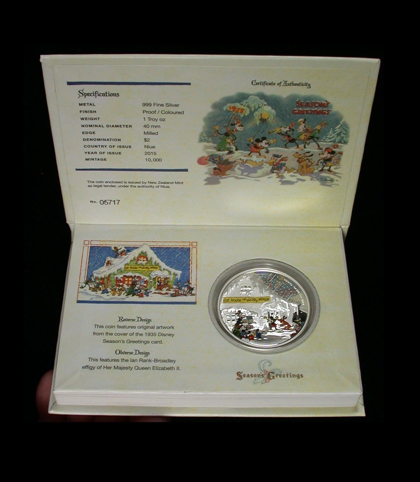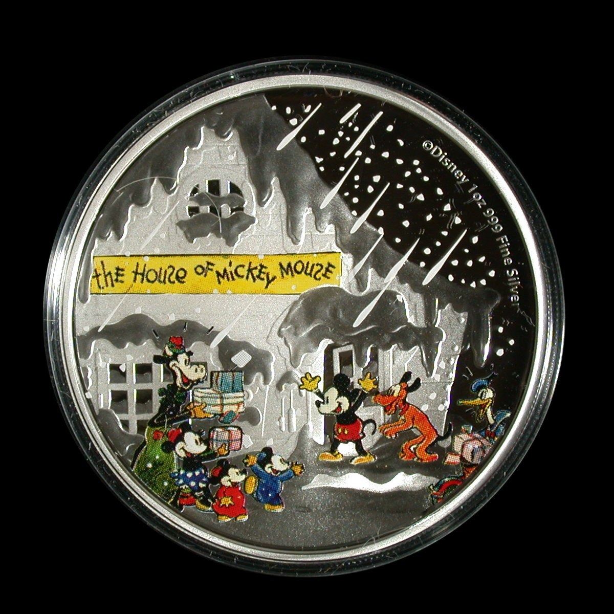 A 40mm, 1 oz .999 Silver Two Dollar coin of the New Zealand Mint, issued for Niue in 2015 and featuring coloured reverse portrait of "The House of Mickey Mouse", as first appeard on the cover of Disney's 1935 Seasons Greeting Cards. Struck to a Proof finish, and housed in original small "book" presentation case, numbered #5717. (This item is HST exempt)