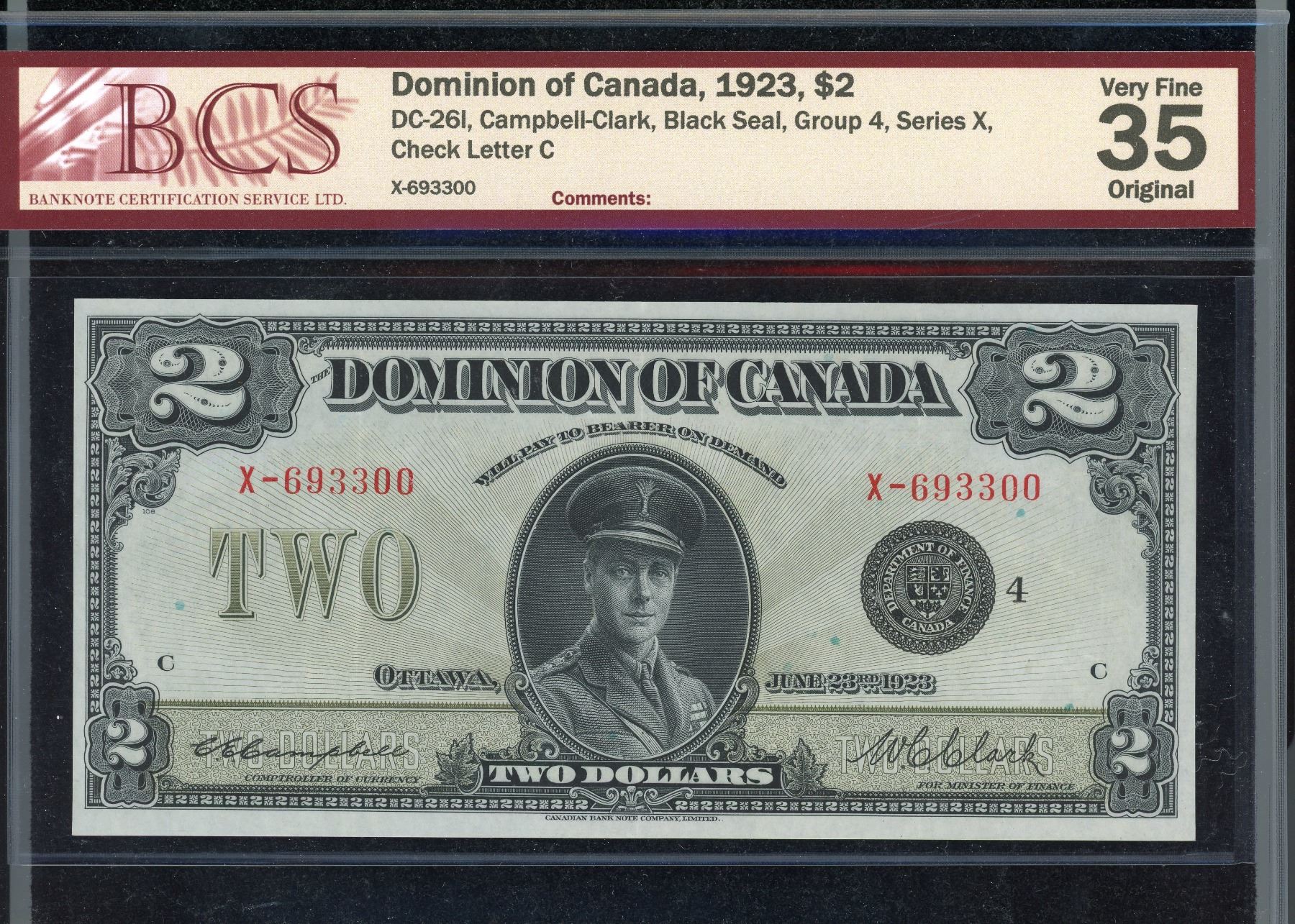 Two Dollars 1923 Prince of Wales, DC-26l, Serial #X-693300, BCS VF-35 and a fresh-looking note