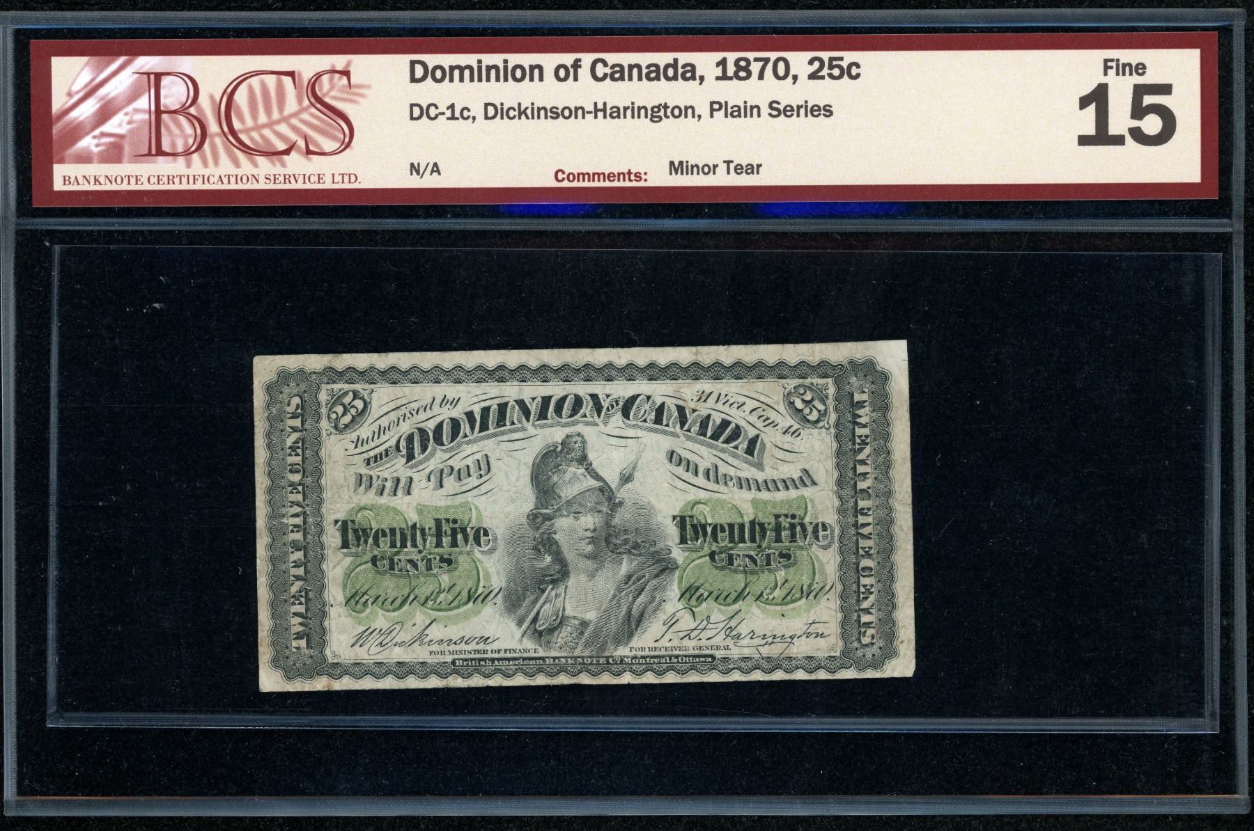 Dominion of Canada Twenty-five Cents 1870 (DC-1c), BCS Fine-15 Minor Tear