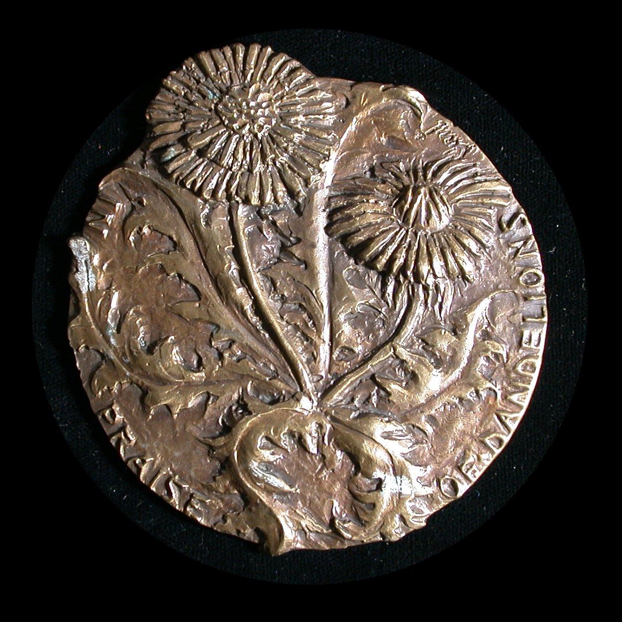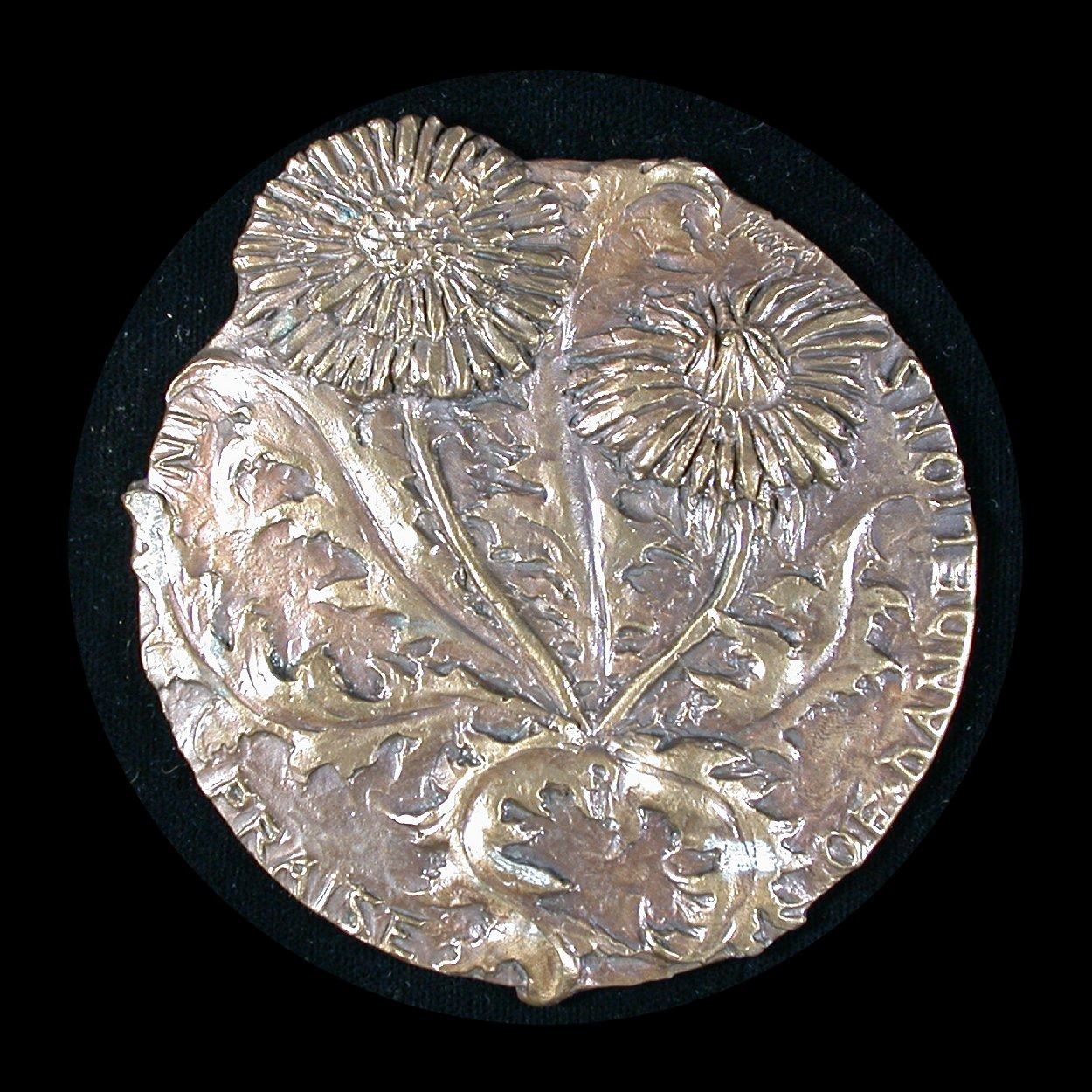 A [varying] 78mm uniface bronze sculpted medal by Dora De Pedery-Hunt, with a pair of wild dandelions bursting beyond the top rim. Signed by Hunt at top-right rim, and a neat piece!
