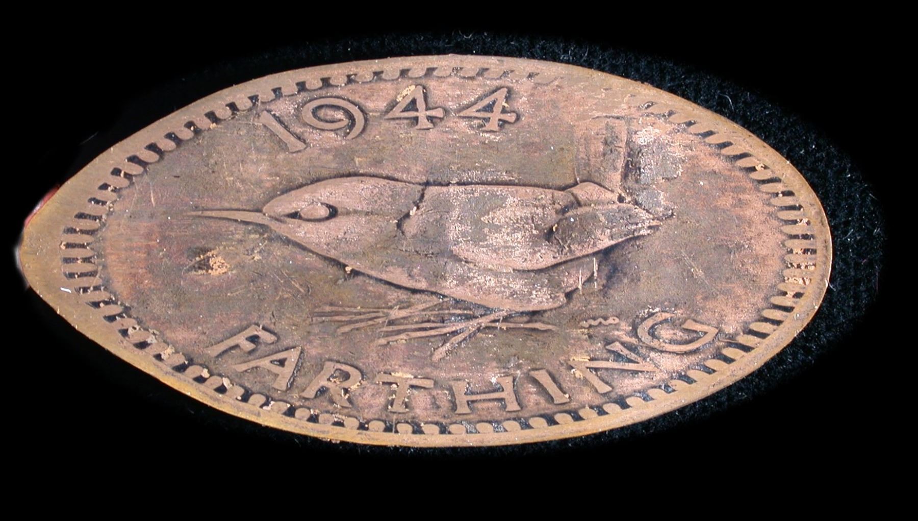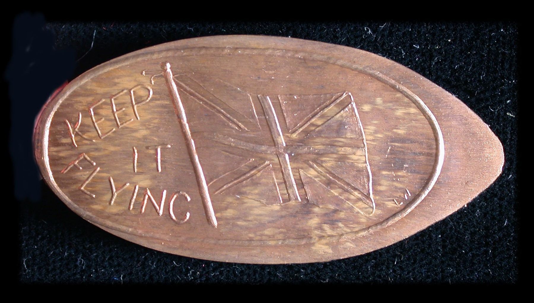 England - a 1944 Pressed Farthing (reverse of host still clearly on back), Union Jack Flag at center, "KEEP IT FLYING" at left.