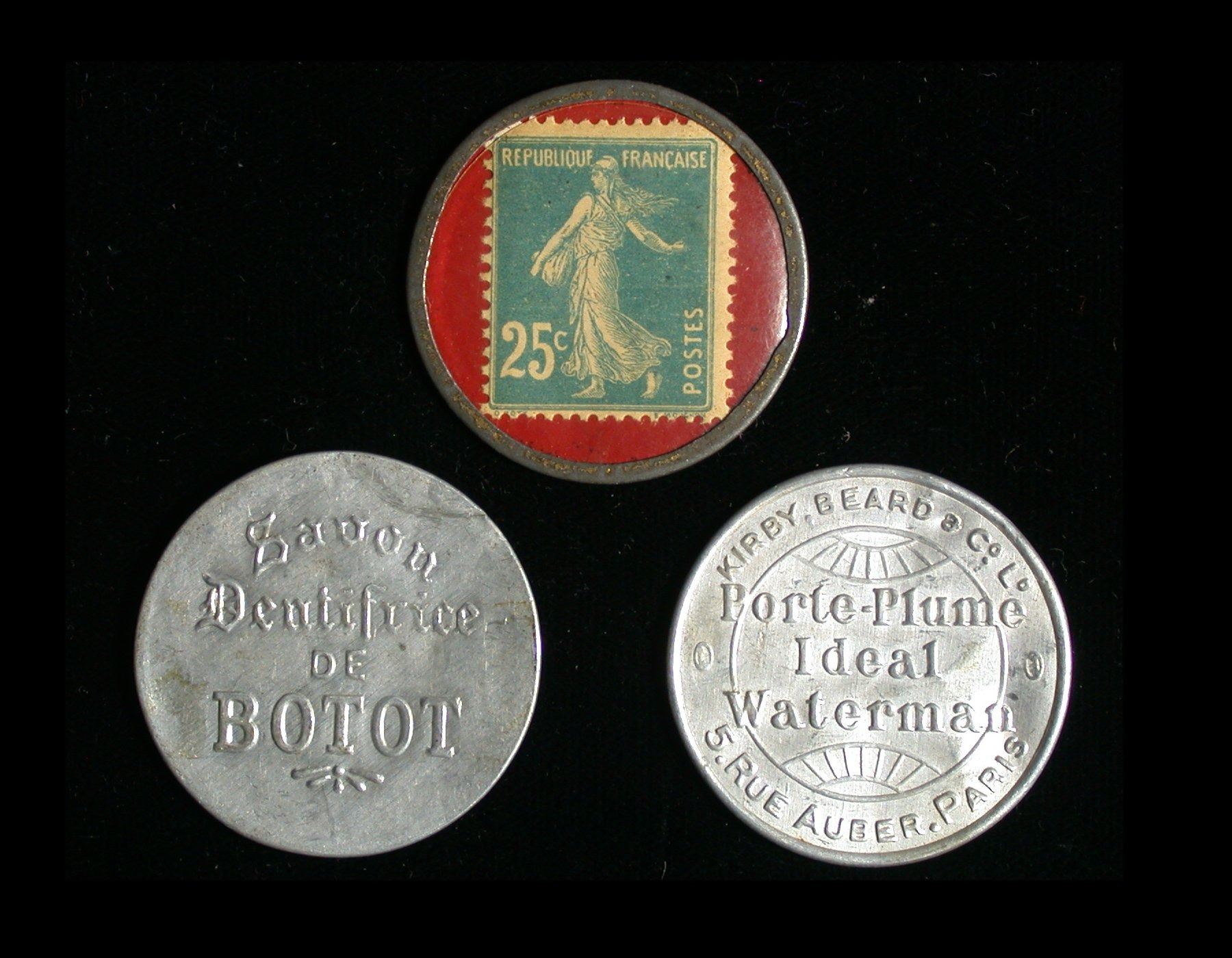 An intresting trio of encased French Postage Stamps, c.1920's, in aluminum or tin advertising casing with stamp under a cellulose film, as follows: "Savon Dentrifice De Botot" (toothpaste), with red 10 Centime stamp under dark and brittle cellulose; "Kirby Beard & Co. Ltd" of Paris (Waterman Pens), with encased green 5 Centimes Stamp; together with a scarcer "Caves Dupont Merklin Champagne Mercier" printed tin-plate with green 25 Centimes stamp. Lot of three tokens, averaging 32mm in diameter