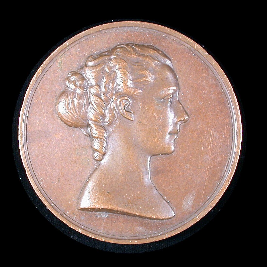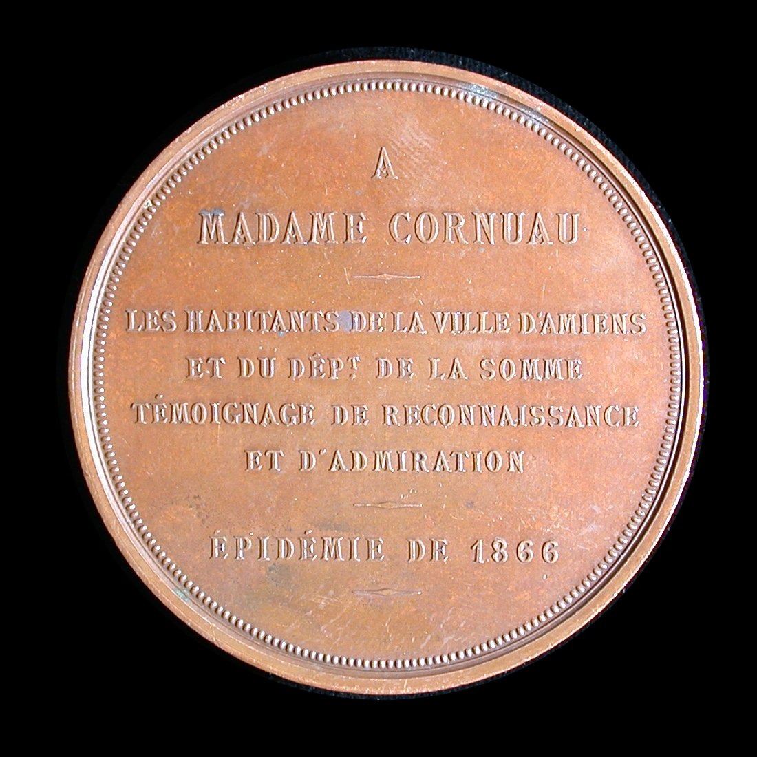 A 67mm copper medal of the Paris Mint, issued in tribute to Madame Cornuau by the residents of Amiens for her selfless service during the great cholera epidemic of 1866. The first striking of the medal, together with a letter, was reportedly delivered to Madame Cornuau on request of the French Empress. Abt.EF with wear on the higher points, a light scuff at reverse bottom, and a number of light edge-nicks and scrapes