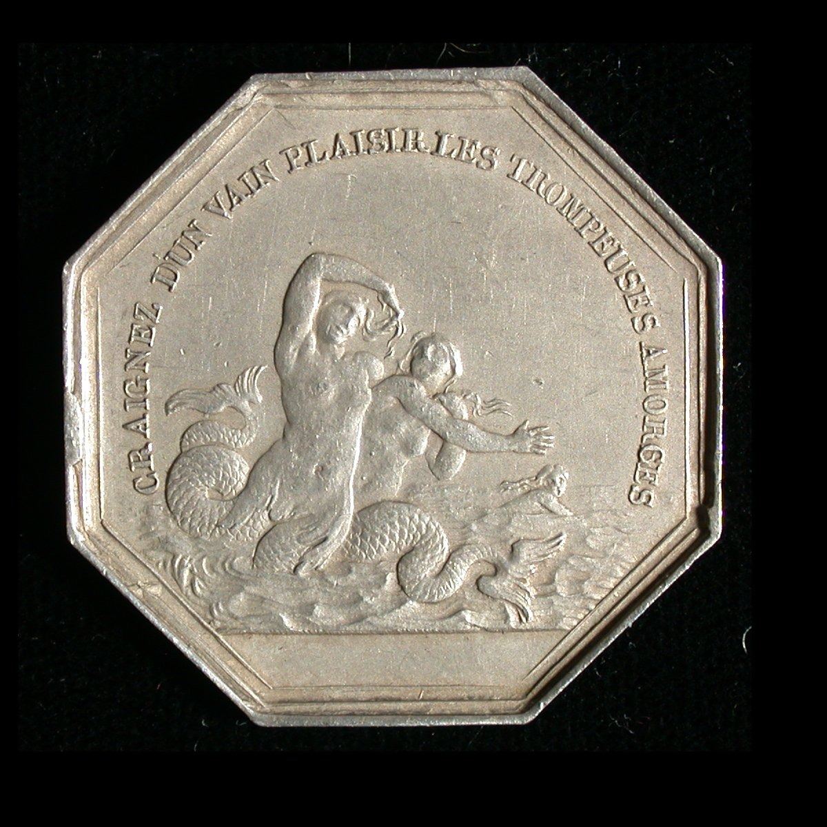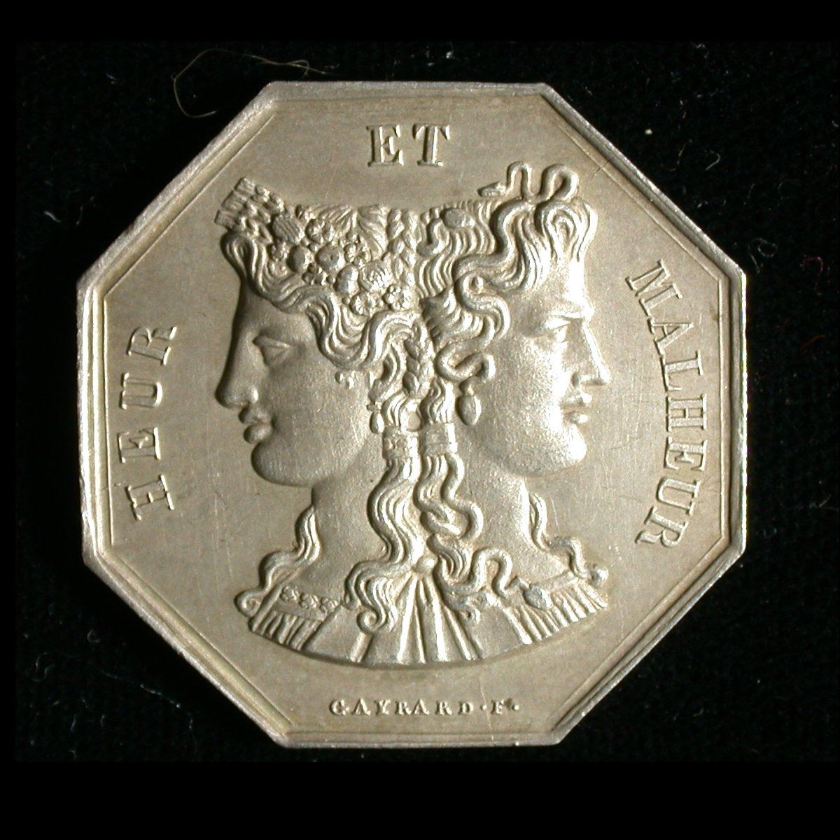 A 30mm, 12.9 gram octagonal Silver token of the Paris Mint by Gayrar F., late 19th century, traditionally given as a "Treizain" during the wedding mass, where it would be blessed. Obv: conjoined portraits looking left and right, "HEUR ET MALHEUR" around circumference, "Gayrard F" below in tiny lettering. Rev: two Sirens of the sea. Edge-impressed "ARGENT" with the mark of the Paris Mint. gEF