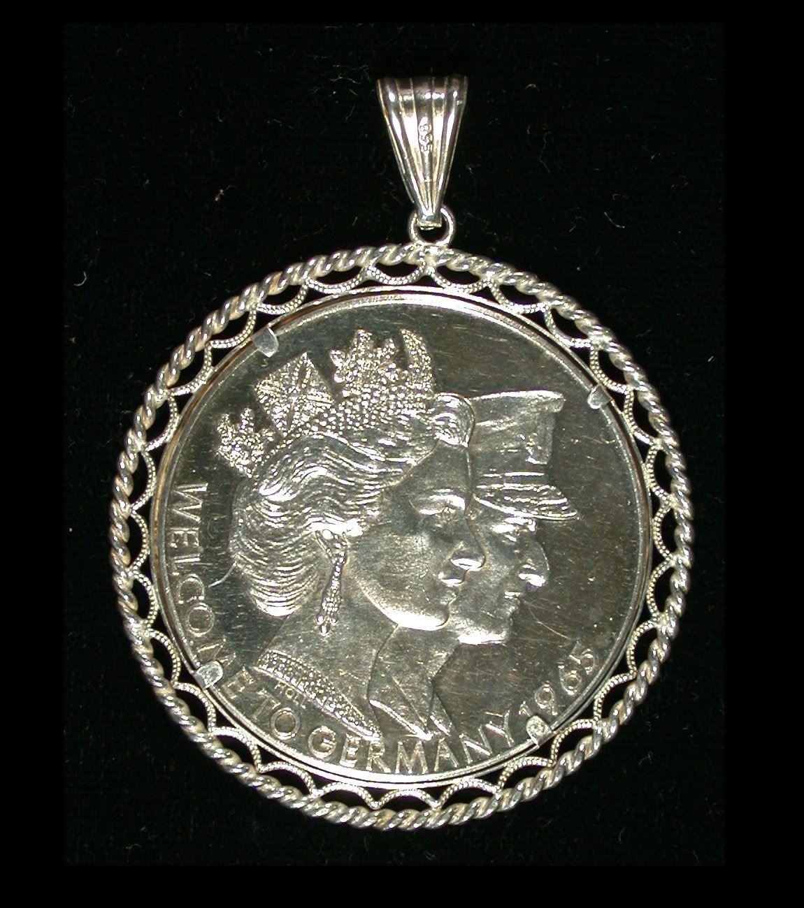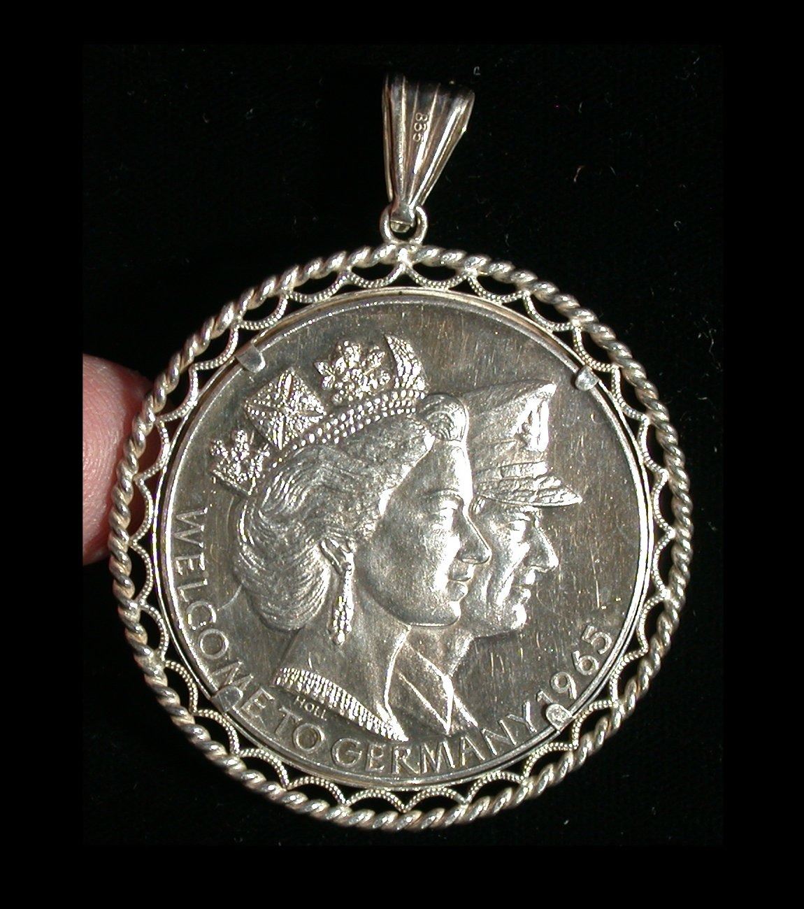 A 40mm, 25.5 gram medal in .999 Silver by Holl, issued to commemorate the 1965 Royal Visit of Queen Elizabeth and Philip to Germany. Rev: right-facing conjoined portraits, text below: "Welcome To Germany 1965"; Obv: German Eagle at center, surrounded by 11 labelled shields of German states. Housed in an ornate .835 silver bezel and suspension ring (overall weight of 31.7 grams), well-detailed EF/AU with expected light signs of wear.