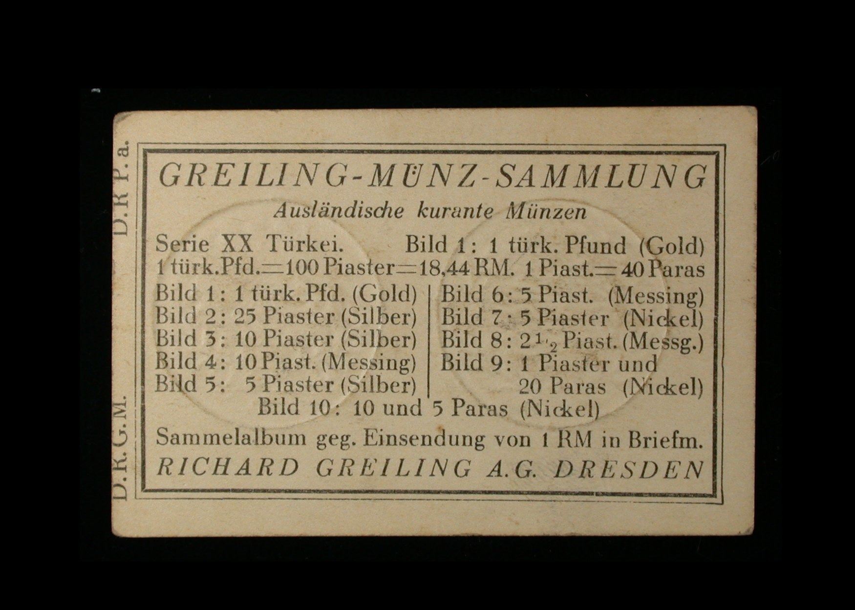 A group of 43 X 60 mm tobacco cards c.1929 by Richard Greiling of Dresden, Germany, each depicting a pair of World Coins in embossed gold foil. Total of 9 varrious cards, representing the coinage of Denmark, Albania X 2, Finland, [imperial] Germany, Costa Rica, Turkey, Afghanistan and Guatemala. All in excellent condition, with slightly rounded corners, and detailed breakdown of respective country's coinage on back. (Lot of 9 cards)