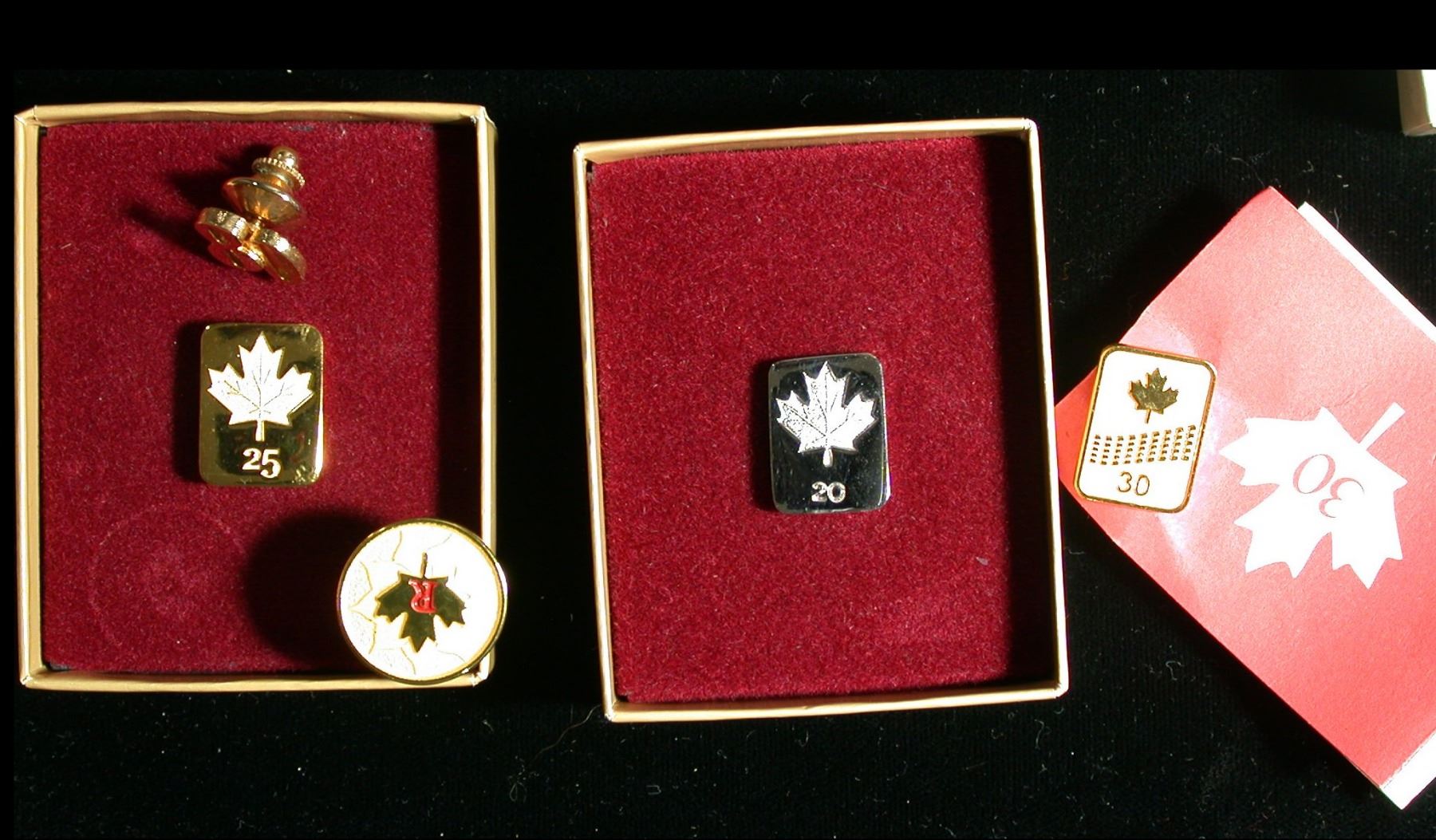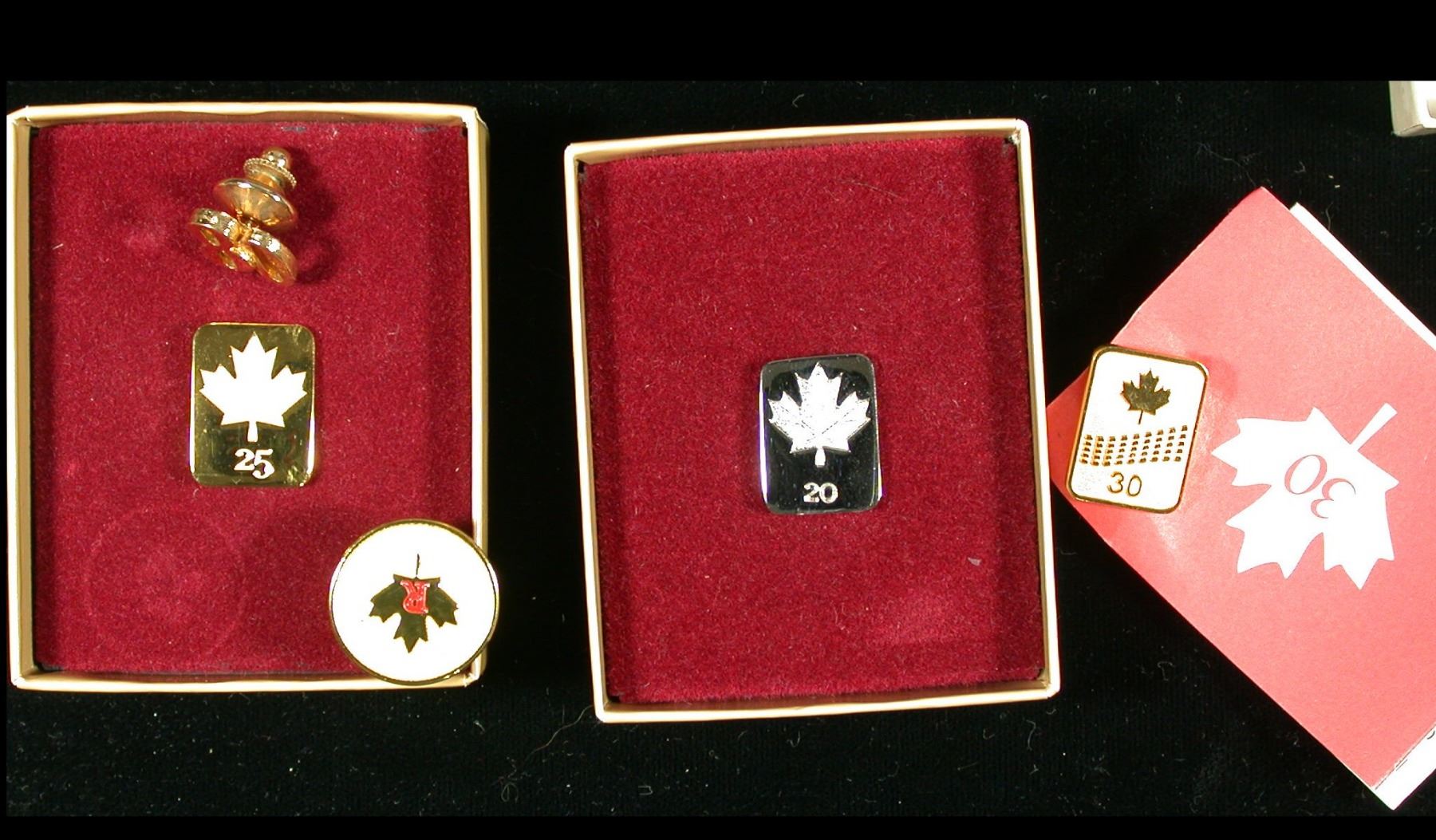 A trio of Canadian Government long-service lapel pins, each 14 x 20mm, consisting of: 20 Years, in Sterlng Silver; 25 Years, in 10K gold-fill; and 30 Years, also in gold-fill. The first two, in small "Seasons" boxes of issue, the lat pin attached to a small info brochure. Also includes and additional "80" in from Avon(?), together with an additional 19mm round gold-plated Government of Canada pin wiht Maple Leaf and red "R" at center. Lot of 5 lapel pins