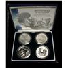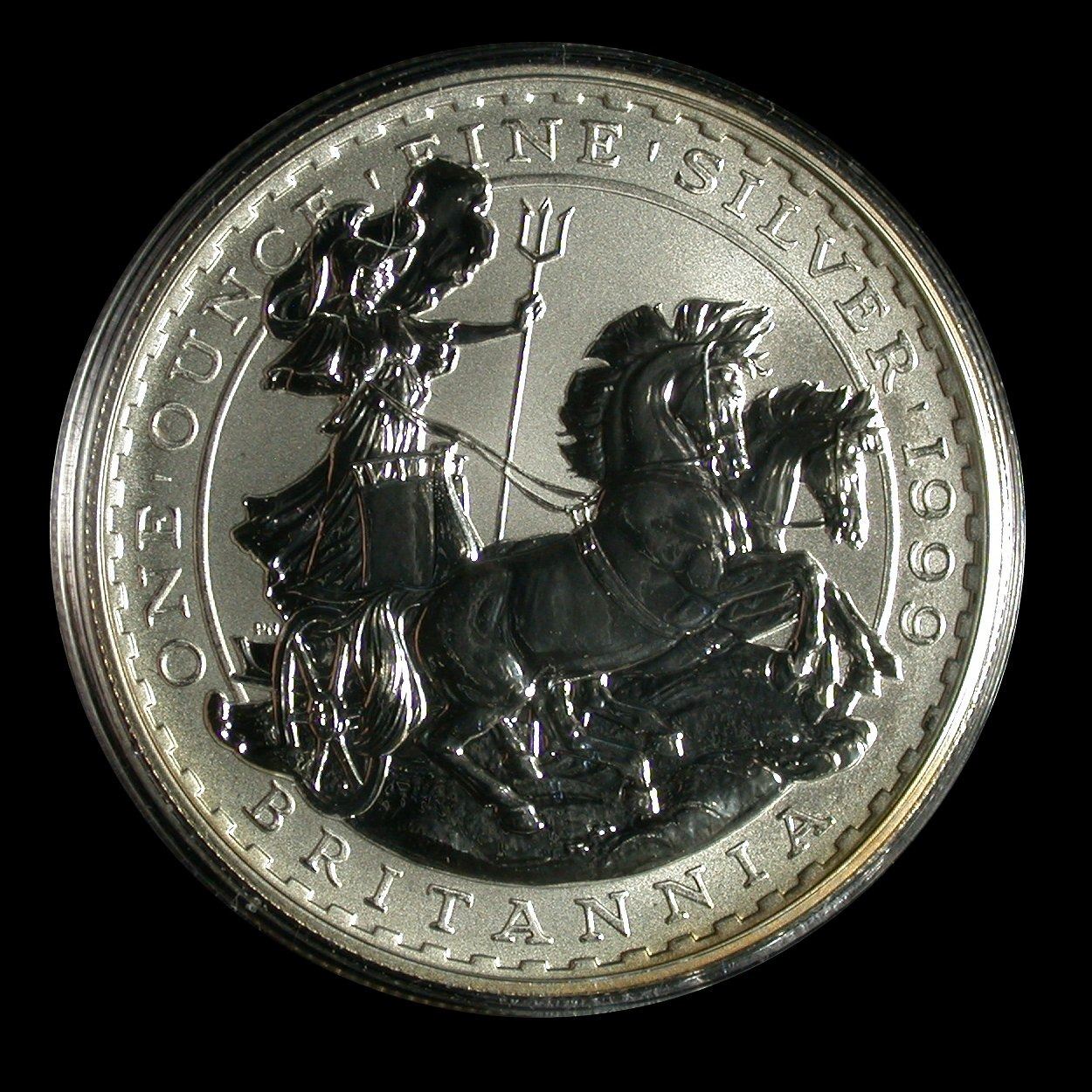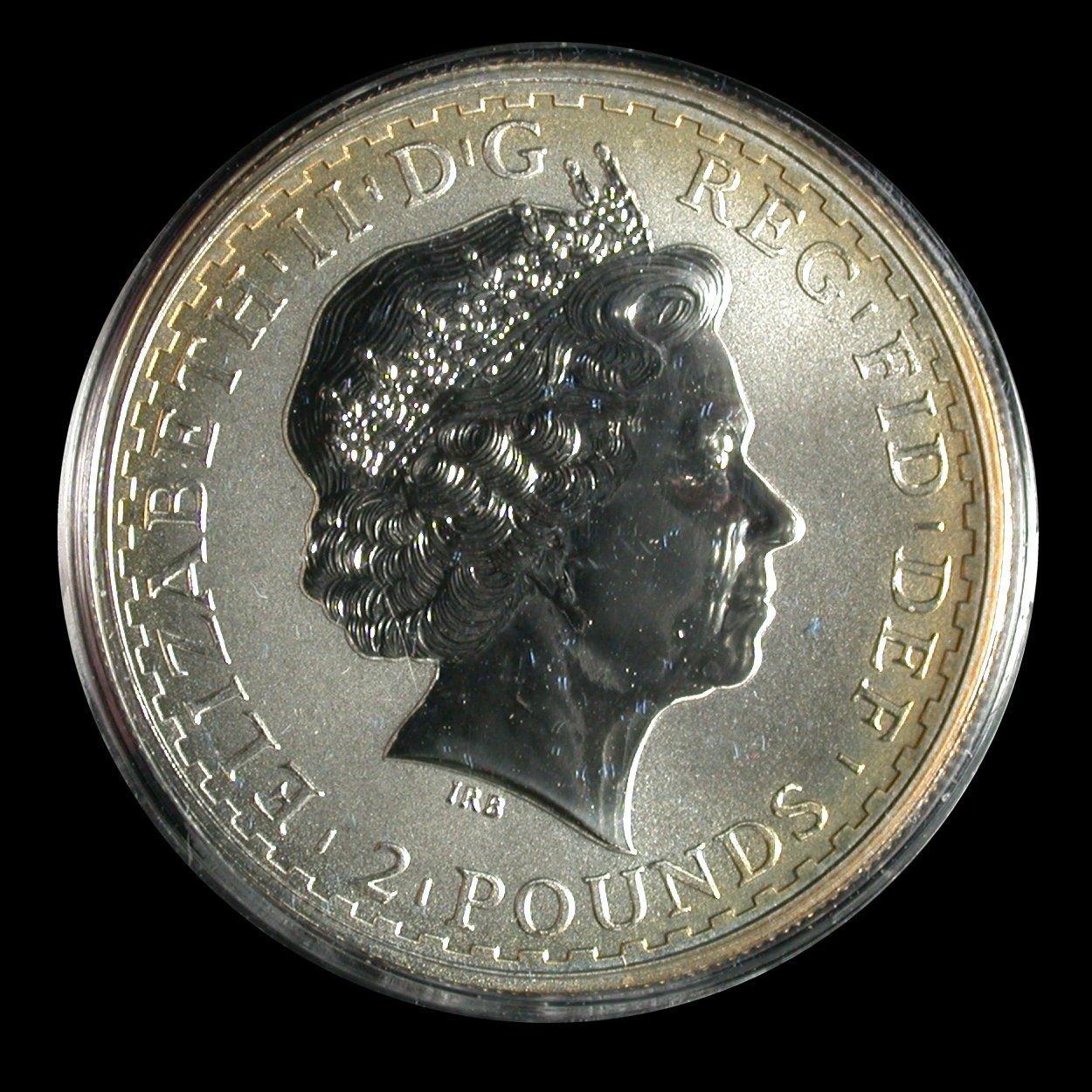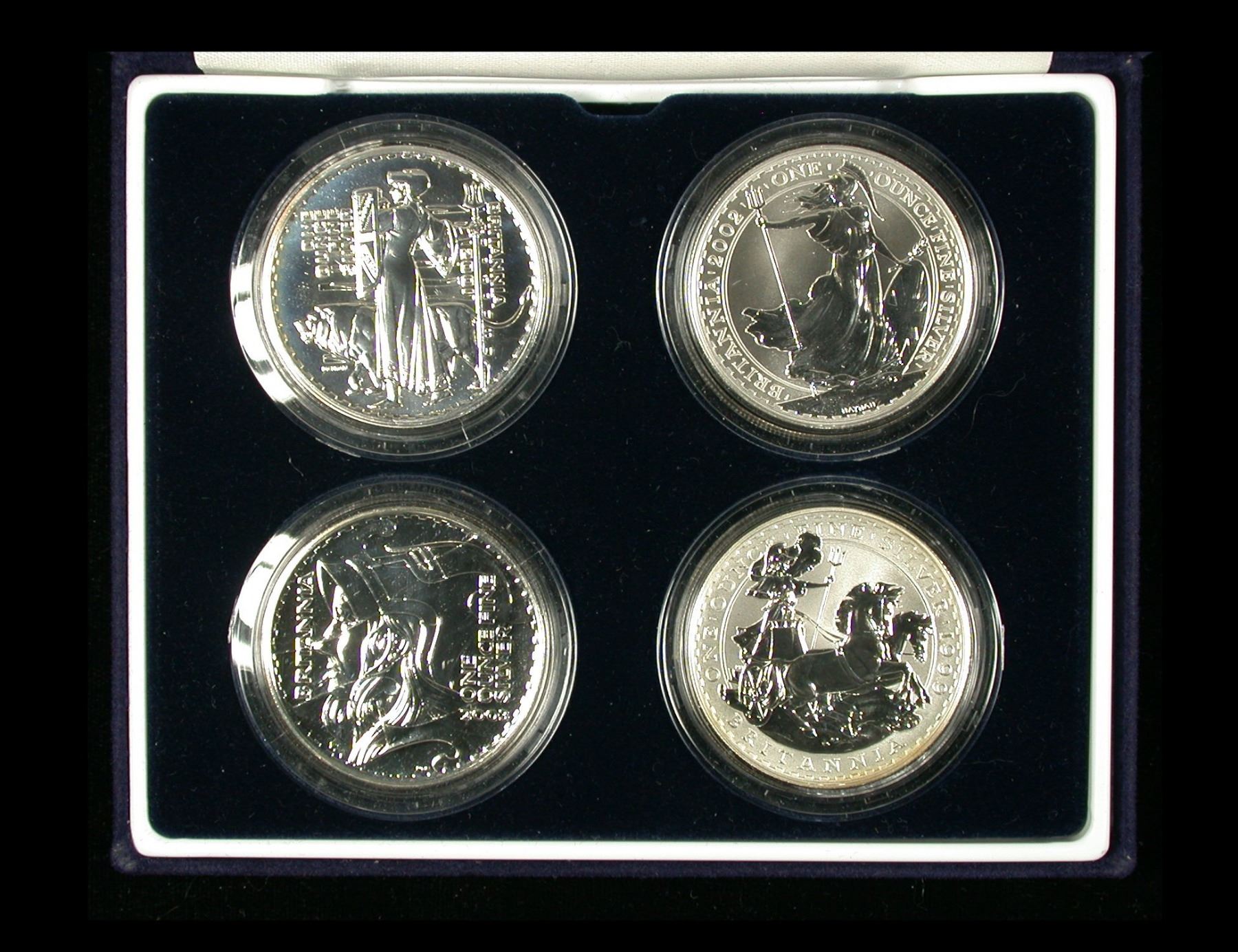 A four-piece set of 1 oz Silver Britannia 2 Pound coins in .958 Silver, assembled and housed in Royal Mint presentation case with certificate. Includes 1999 2001, 2002 and 2003 issues, representing the four different Britannia designs, all encapsulated, some with light golden toning around obverse rims. (Set of 4 coins)