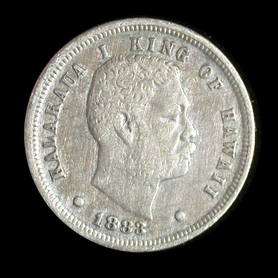 A Silver 1883 One Dime of Hawaii, King Kalakaua I on obverse (KM.3). gFine with sharp date and legends, though reverse has two small slightly raised posts at center, having once been mounted as a button. A pleasant and affordable example of this single-year issue