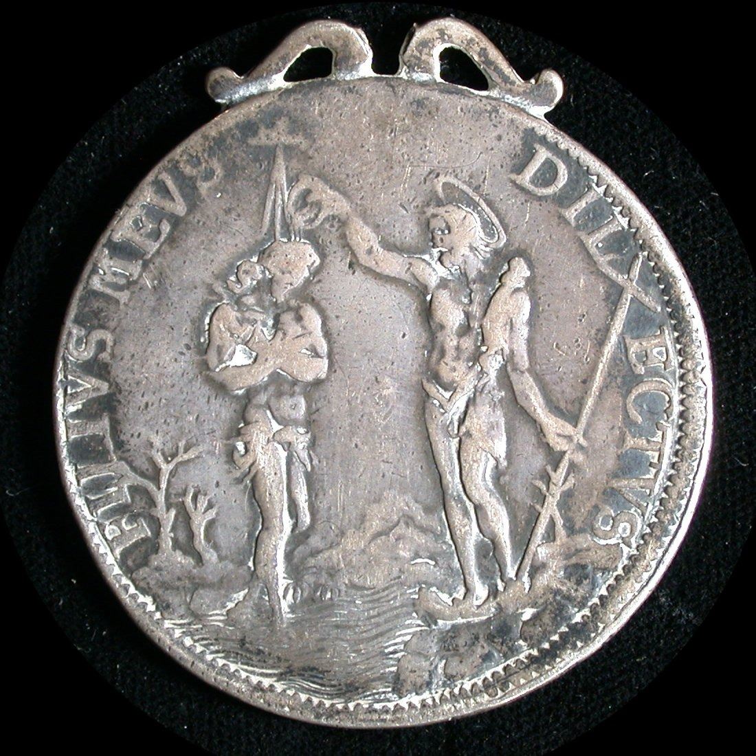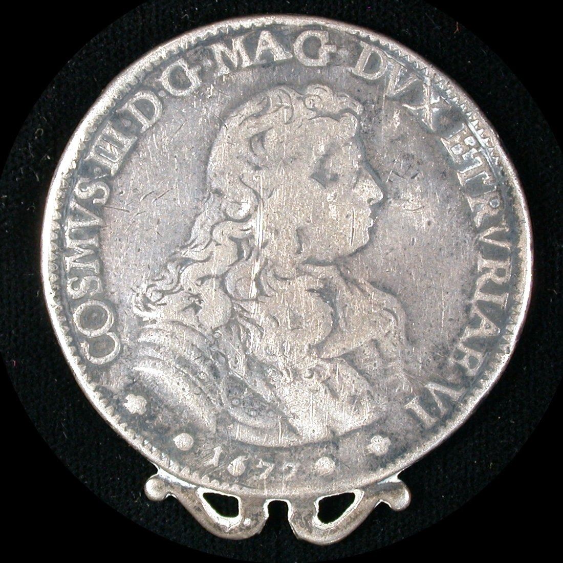 Tuscany, a 43mm Silver Piastre of Grand Duke Cosimo III de Medici, 1677; Obv: draped & armored bust right, date below; Rev: Christ standing right, in River Jordan, being anoited by St. John the Baptist at right, holding a long cross. DAV.#4209, pleasant VG with good clear text and date, very slight bend in flan, with partial ornate suspension clasp at reverse top.