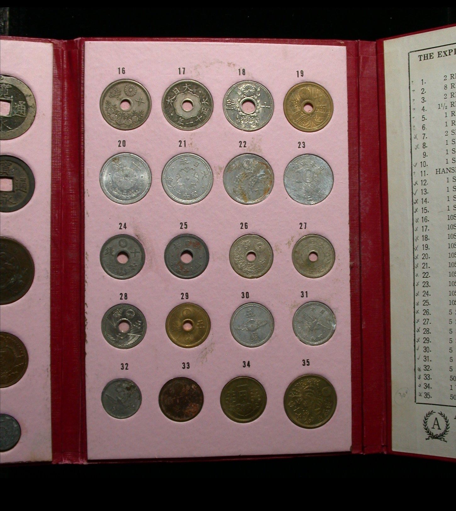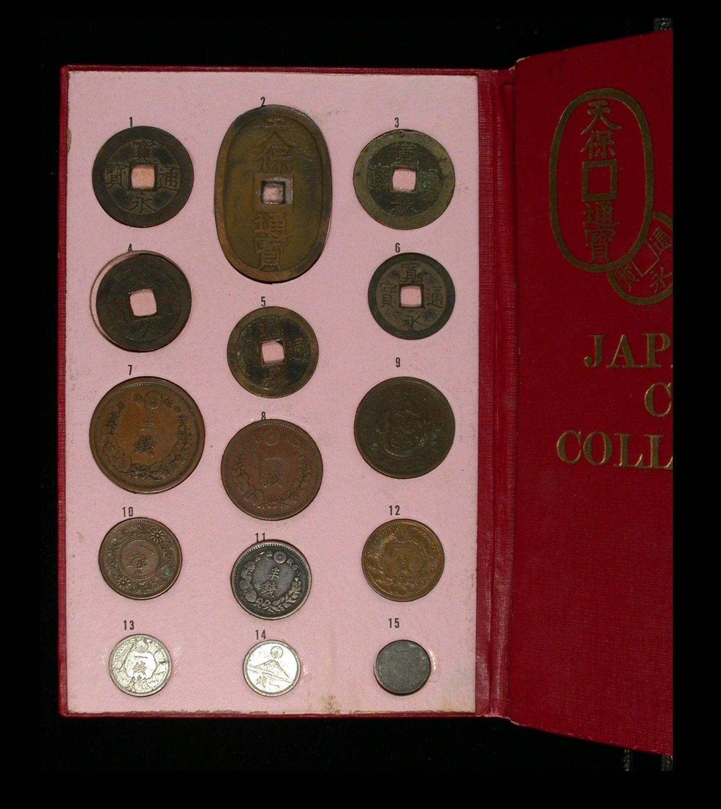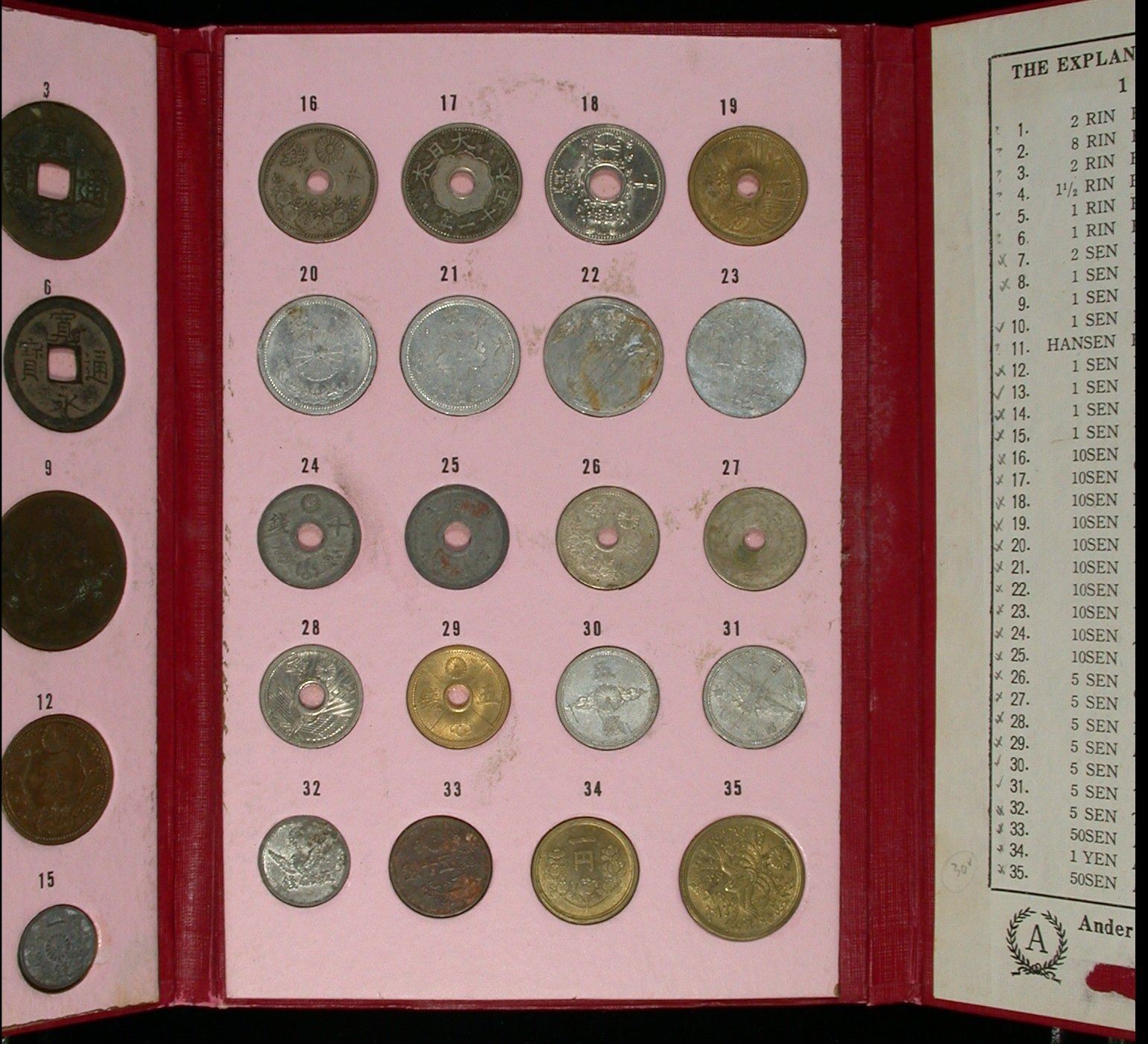 An interesting "Japanese Coin Collection" as assembled by Anderson Import-Export Company (c.1950's), consisting of 35 labelled coins, dating from the late 17th century to about 1950, neatly housed in a small red folder/album. All fully authetic, and an interesting numismatic artifact overall
