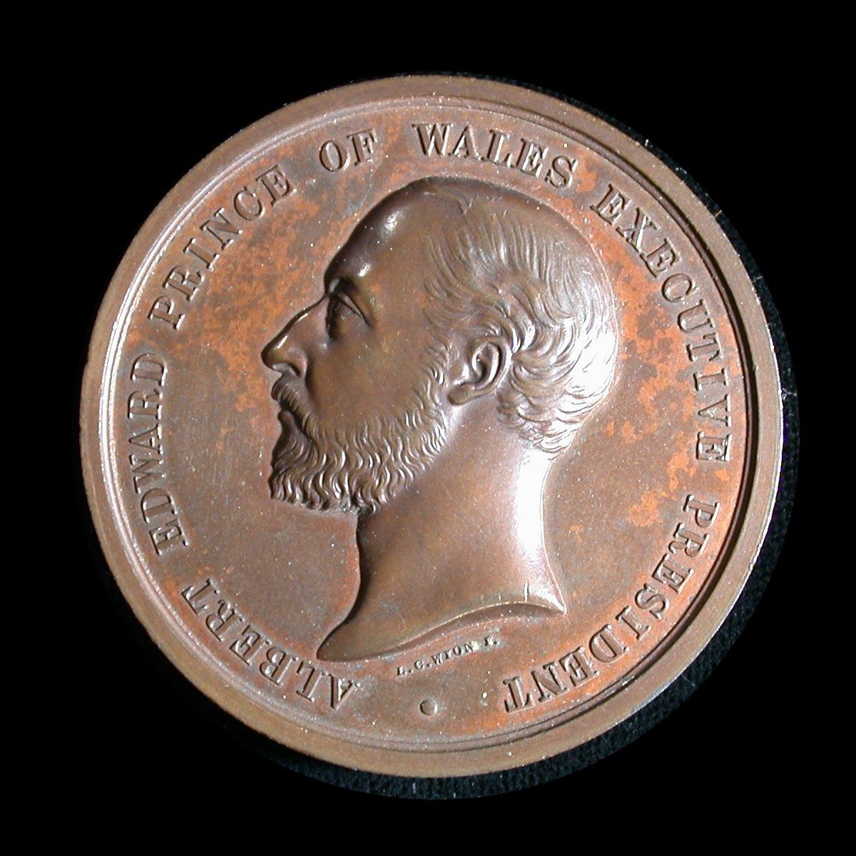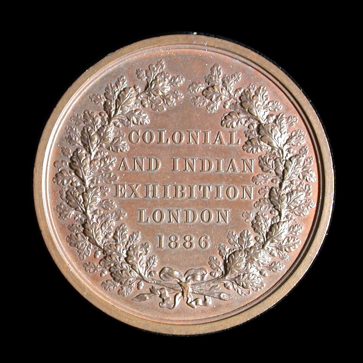 An attractive 52mm bronze medal by L.C. Wyon, issued to commemorate the 1860 Colonial and Indian Exhibition of 1886, held in London. With reverse portrait of the Prince of Wales (later Edward VII), pleasant AU and free from the usual edge-dings that so often impair these medals (a small patch of green verdigres on the outer edge should be removable).
