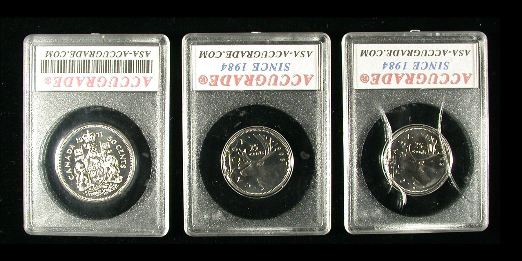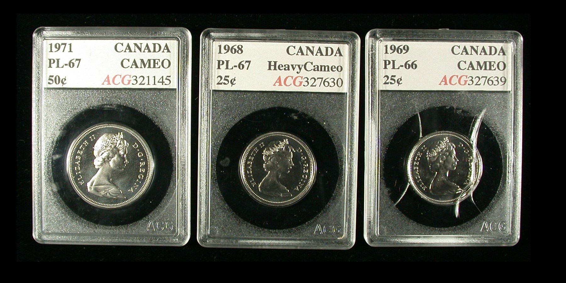 A trio of Canadian coins in tiny 50 x 70mm Accugrade slabs, as follows: 25 Cents 1968 PL-67 Heavy Cameo; 25 Cents 1969 PL-66 Cameo, together with 50 Cents 1971 PL-67 Cameo (note: the 1969 quarter has signficant cracks in the holder, on either side of coin). Lot of three nice cameo coins
