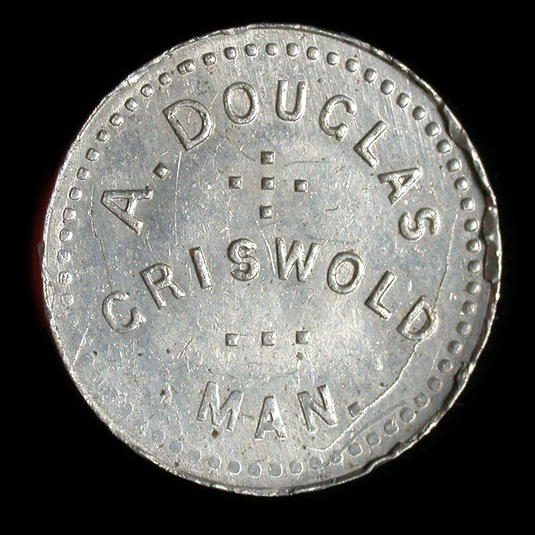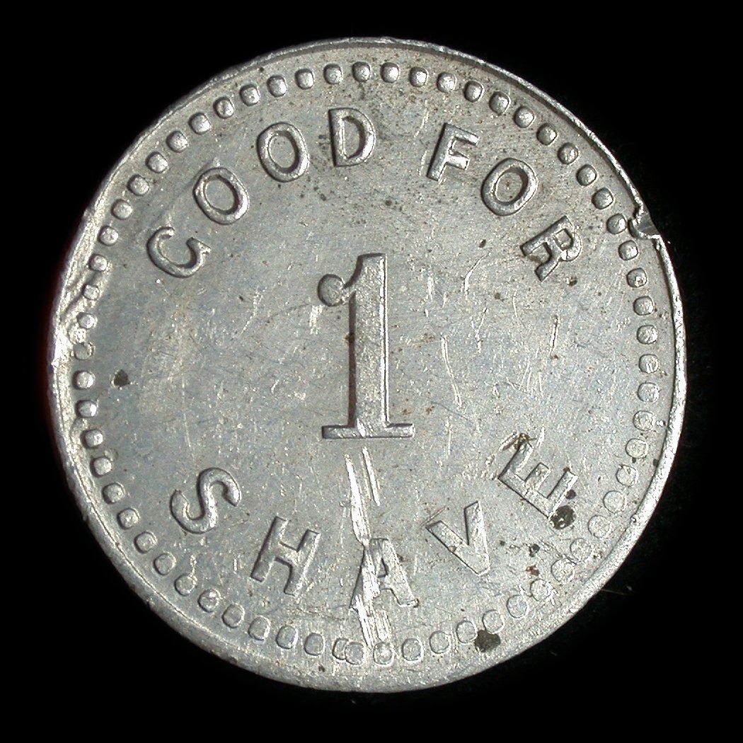 A 22.5 aluminum "GOOD FOR 1 SHAVE" Token from A. Douglas, Griswold, Manitoba. Struck from a broken obverse die, a nice AU example with a few light edge-nicks