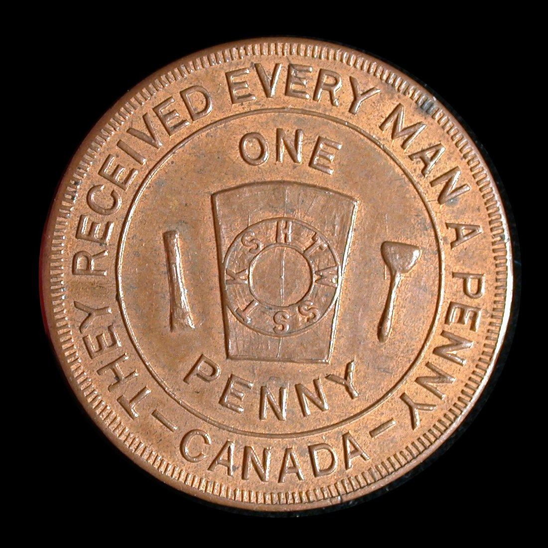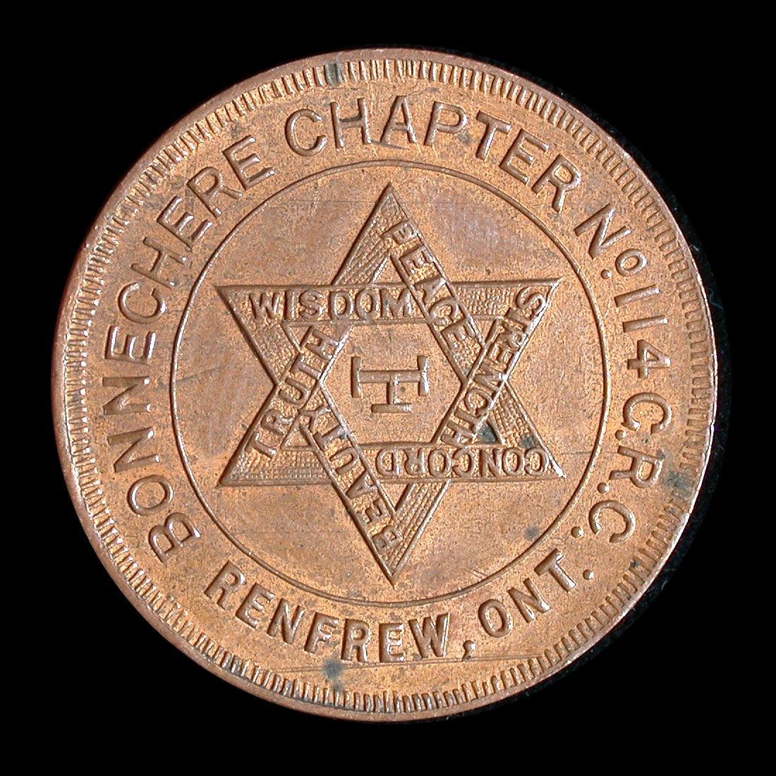 A 35mm copper Masonic Penny Token of the Bonnechere Chapter No. 114 C.R.C of Renfrew, Ontario. A nice AU example with good luster