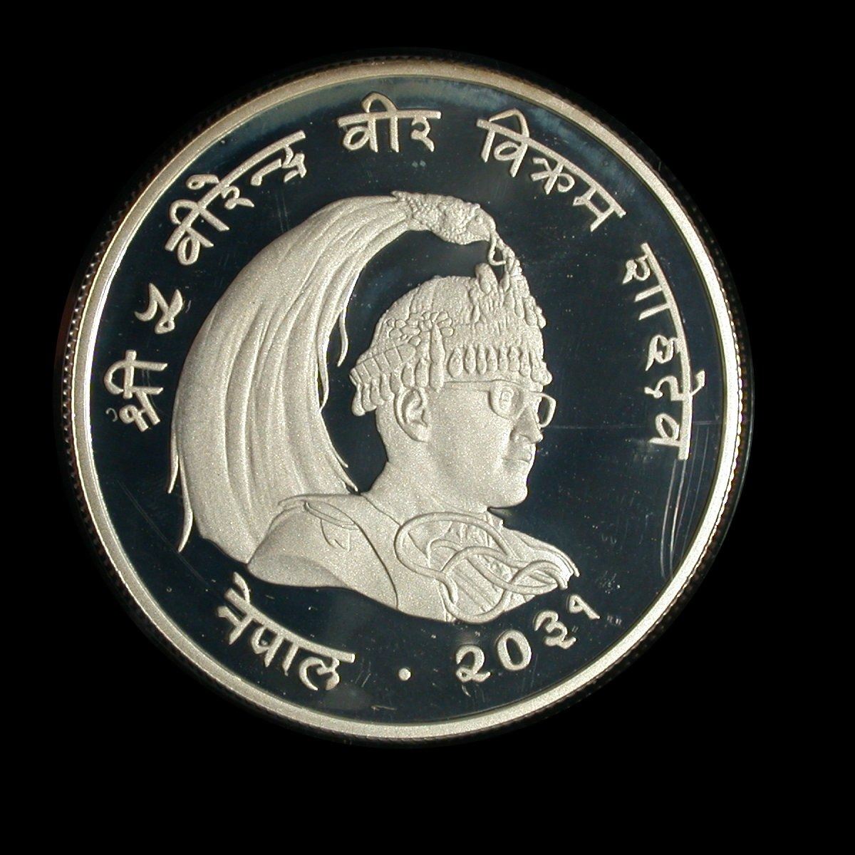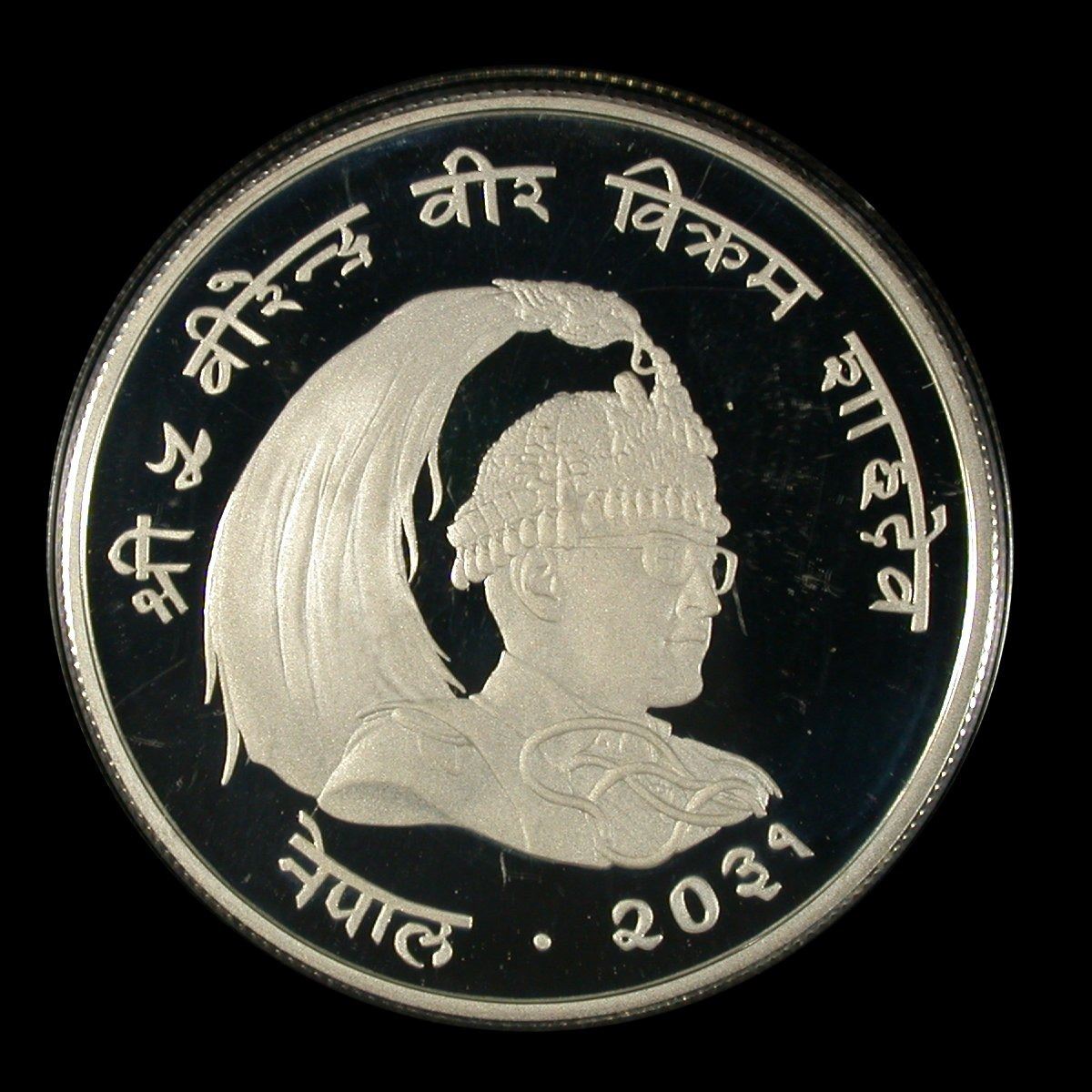 A lot of two (1974) Proof Silver Conservation Crowns from Nepal, consisting of: 25 Rupee KM.839a (Himalayan Monal Pheasant), together with 50 Rupee KM.841a (Red Panda). Both Proof Sterling Silver, and housed in original capsules. (Lot of 2 coins)